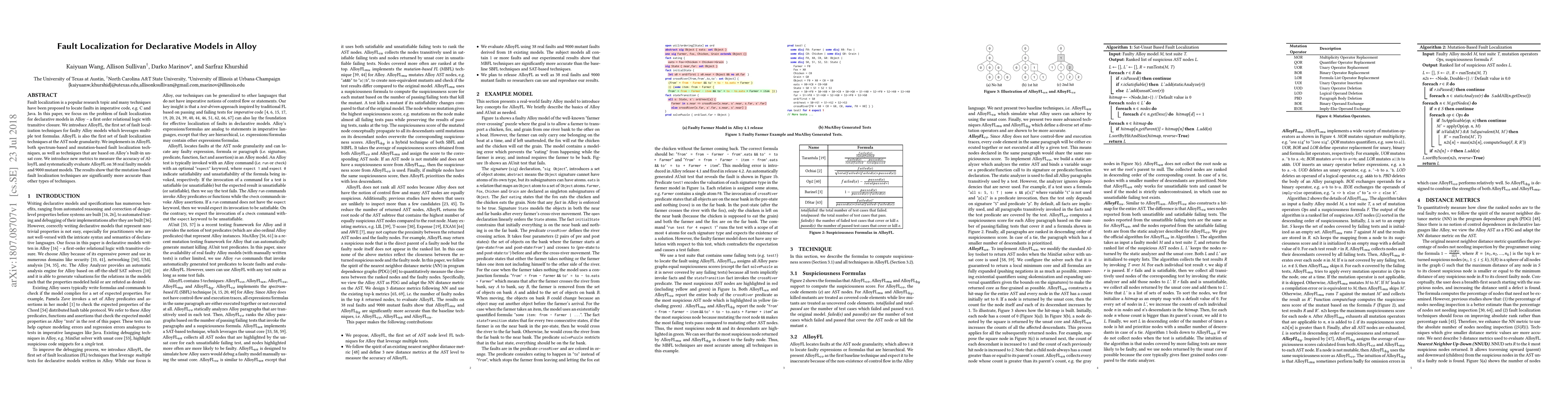 This paper introduces AlloyFL, the first fault localization techniques for declarative Alloy models, employing spectrum-based, mutation-based, and unsat core-based methods. Evaluation on 38 real faulty models and 9000 mutants demonstrates that mutation-based techniques are notably more accurate.