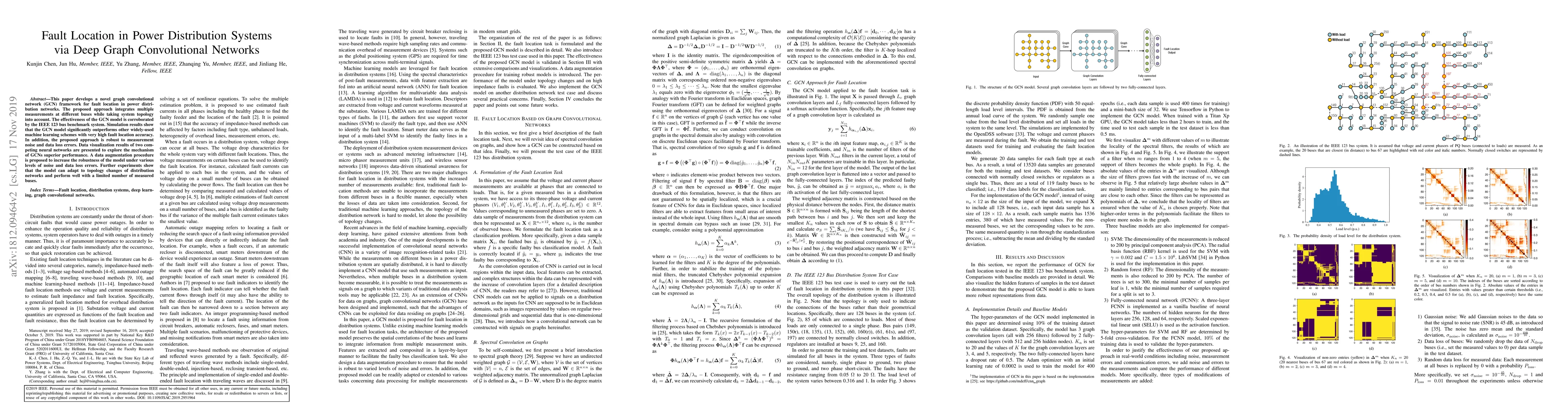 This paper proposes a graph convolutional network (GCN) framework for fault location in power distribution systems, demonstrating superior accuracy and robustness compared to other machine learning methods, especially under noisy conditions and data loss. The GCN model is validated on the IEEE 123 bus system and shows adaptability to network topology changes.