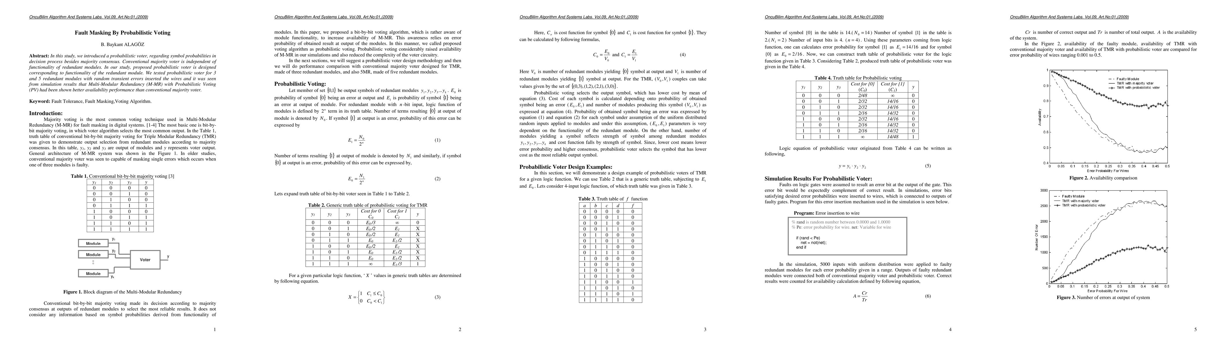In this study, we introduced a probabilistic voter, regarding symbol probabilities in decision process besides majority consensus. Conventional majority voter is independent of functionality of redundant modules. In our study, proposed probabilistic voter is designed corresponding to functionality of the redundant module. We tested probabilistic voter for 3 and 5 redundant modules with random transient errors inserted the wires and it was seen from simulation results that Multi-Modular Redundancy (M-MR) with Probabilistic Voting (PV) had been shown better availability performance than conventional majority voter.