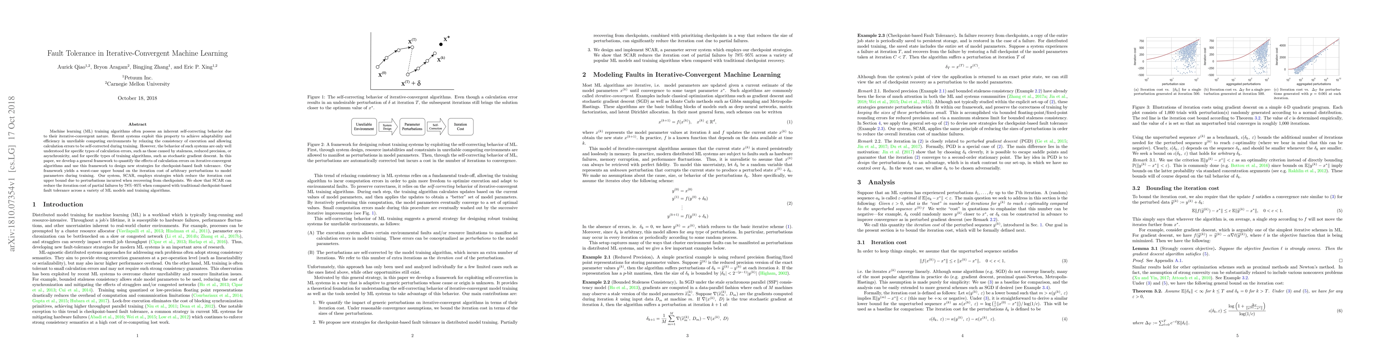 This paper develops a framework to quantify the impact of calculation errors on iterative-convergent machine learning algorithms, introducing SCAR, a system that employs checkpoint-based fault tolerance strategies to reduce iteration costs during recovery from failures, achieving 78% - 95% improvement over traditional methods.