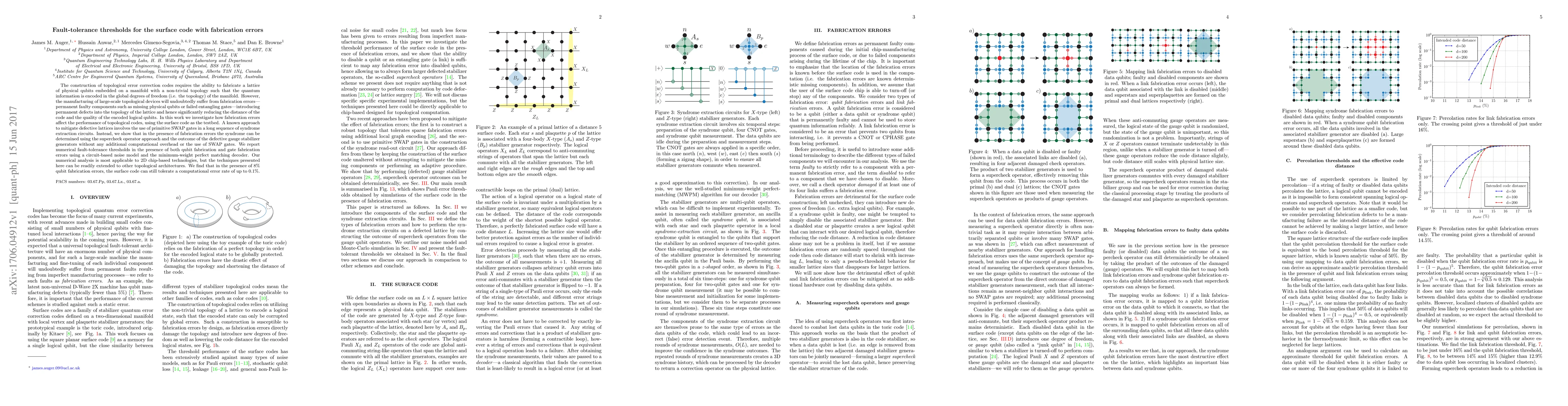 Researchers investigated how fabrication errors affect topological codes, specifically finding that defects can be diagnosed without additional overhead, allowing the surface code to tolerate up to 0.1% computational errors with 8% qubit fabrication errors.