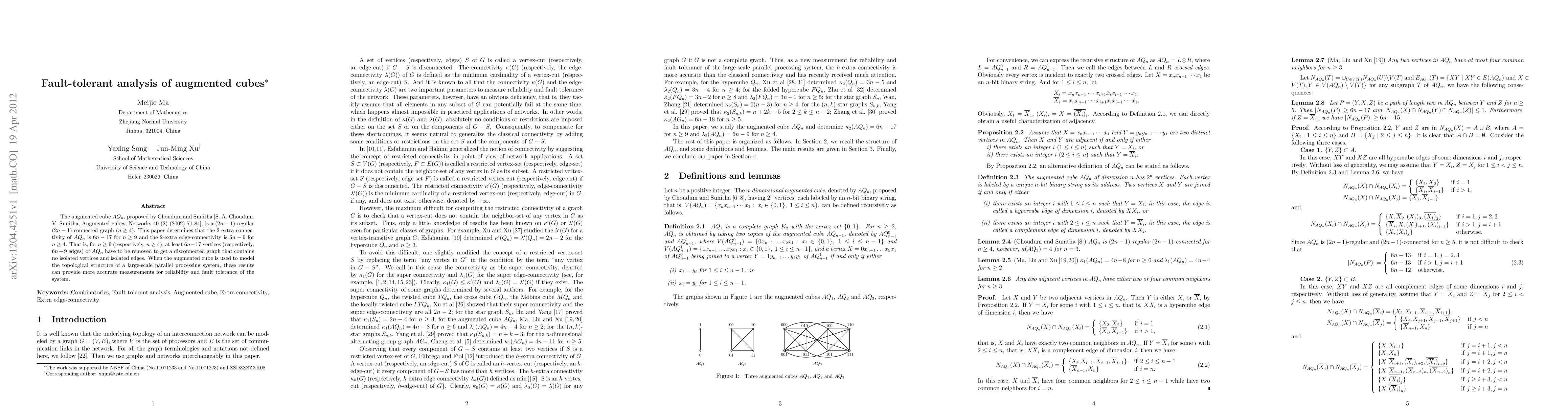 The augmented cube $AQ_n$, proposed by Choudum and Sunitha [S. A. Choudum, V. Sunitha, Augmented cubes, Networks 40 (2) (2002) 71-84], is a $(2n-1)$-regular $(2n-1)$-connected graph $(n\ge 4)$. This paper determines that the 2-extra connectivity of $AQ_n$ is $6n-17$ for $n\geq 9$ and the 2-extra edge-connectivity is $6n-9$ for $n\geq 4$. That is, for $n\geq 9$ (respectively, $n\geq 4$), at least $6n-17$ vertices (respectively, $6n-9$ edges) of $AQ_n$ have to be removed to get a disconnected graph that contains no isolated vertices and isolated edges. When the augmented cube is used to model the topological structure of a large-scale parallel processing system, these results can provide more accurate measurements for reliability and fault tolerance of the system.