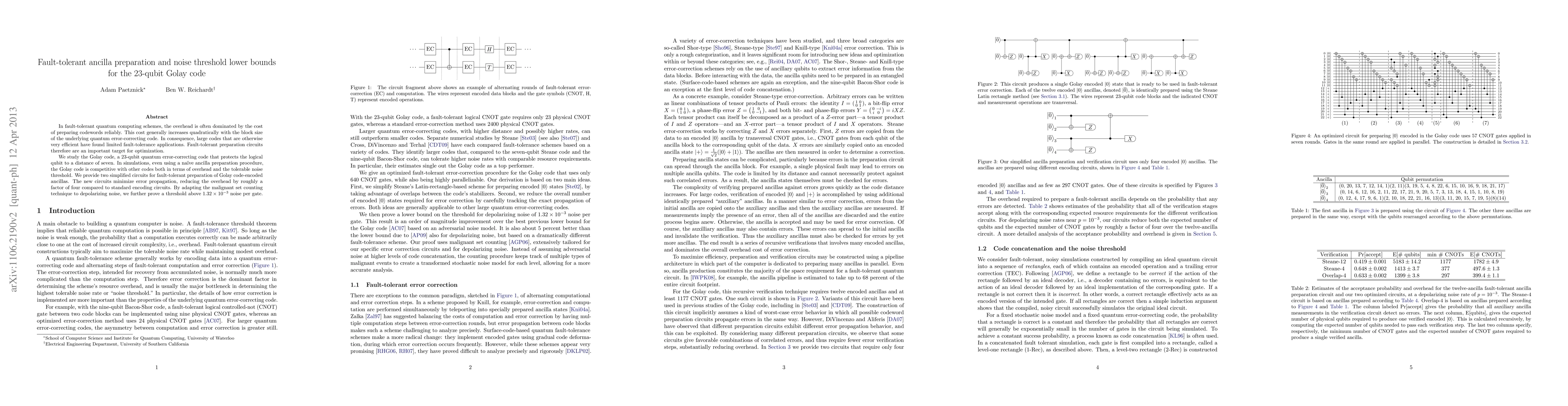 The paper presents optimized fault-tolerant preparation circuits for the 23-qubit Golay code, minimizing overhead and reducing error propagation by a factor of four. It also establishes a noise threshold of above 1.32 x 10^{-3} per gate, demonstrating the code's competitiveness with other quantum error-correcting codes.