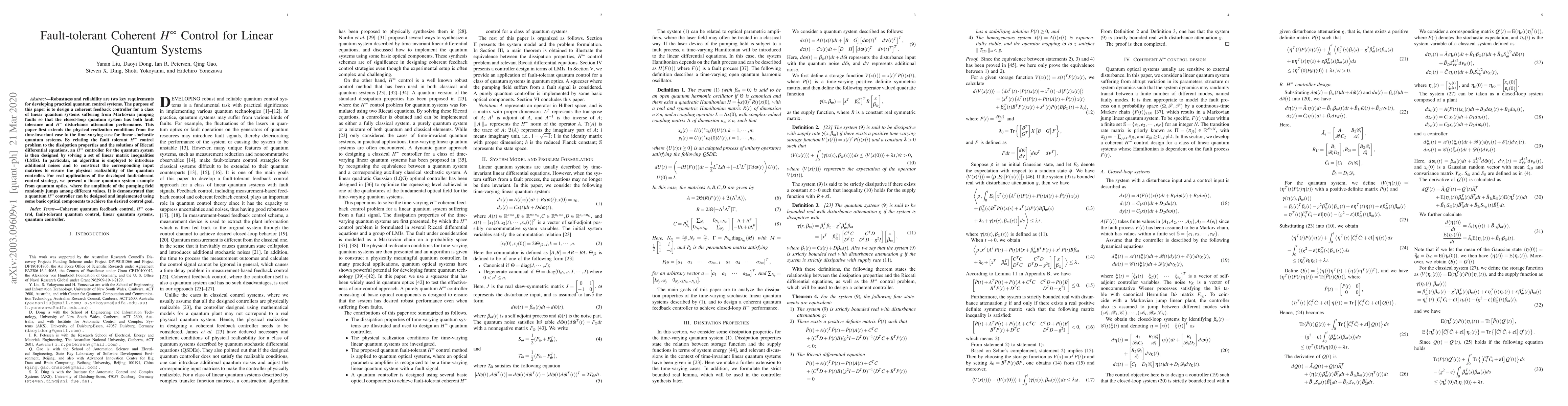Robustness and reliability are two key requirements for developing practical quantum control systems. The purpose of this paper is to design a coherent feedback controller for a class of linear quantum systems suffering from Markovian jumping faults so that the closed-loop quantum system has both fault tolerance and H-infinity disturbance attenuation performance. This paper first extends the physical realization conditions from the time-invariant case to the time-varying case for linear stochastic quantum systems. By relating the fault tolerant H-infinity control problem to the dissipation properties and the solutions of Riccati differential equations, an H-infinity controller for the quantum system is then designed by solving a set of linear matrix inequalities (LMIs). In particular, an algorithm is employed to introduce additional noises and to construct the corresponding input matrices to ensure the physical realizability of the quantum controller. For real applications of the developed fault-tolerant control strategy, we present a linear quantum system example from quantum optics, where the amplitude of the pumping field randomly jumps among different values. It is demonstrated that a quantum H-infinity controller can be designed and implemented using some basic optical components to achieve the desired control goal.