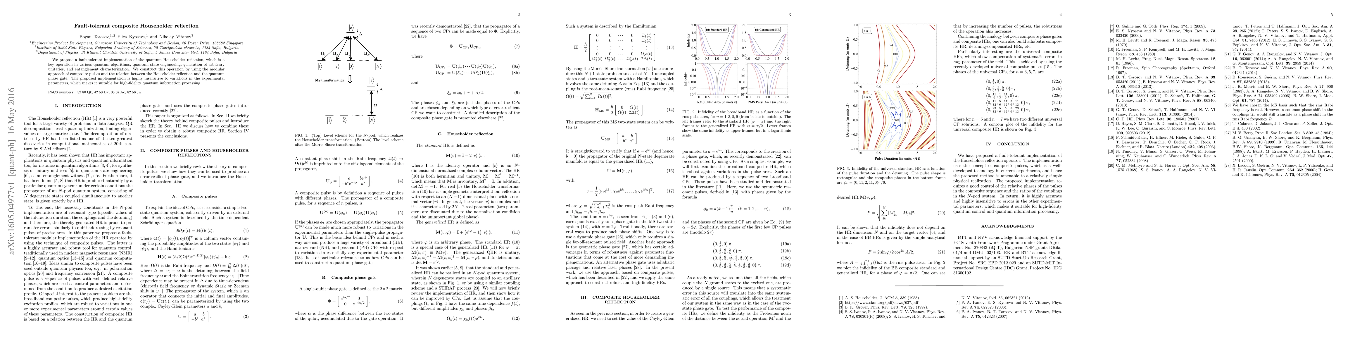 We propose a fault-tolerant implementation of the quantum Householder reflection, which is a key operation in various quantum algorithms, quantum-state engineering, generation of arbitrary unitaries, and entanglement characterization. We construct this operation using the modular approach of composite pulses and a relation between the Householder reflection and the quantum phase gate. The proposed implementation is highly insensitive to variations in the experimental parameters, which makes it suitable for high-fidelity quantum information processing.