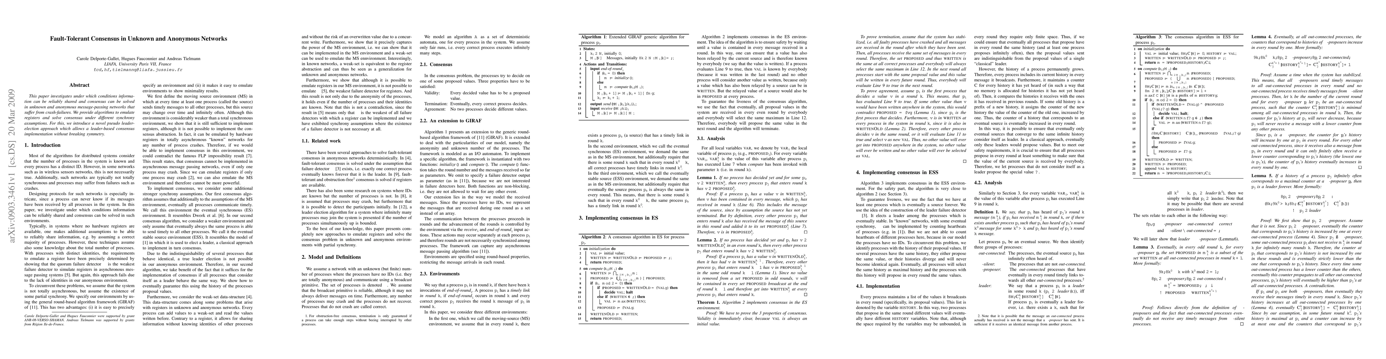 This paper investigates under which conditions information can be reliably shared and consensus can be solved in unknown and anonymous message-passing networks that suffer from crash-failures. We provide algorithms to emulate registers and solve consensus under different synchrony assumptions. For this, we introduce a novel pseudo leader-election approach which allows a leader-based consensus implementation without breaking symmetry.