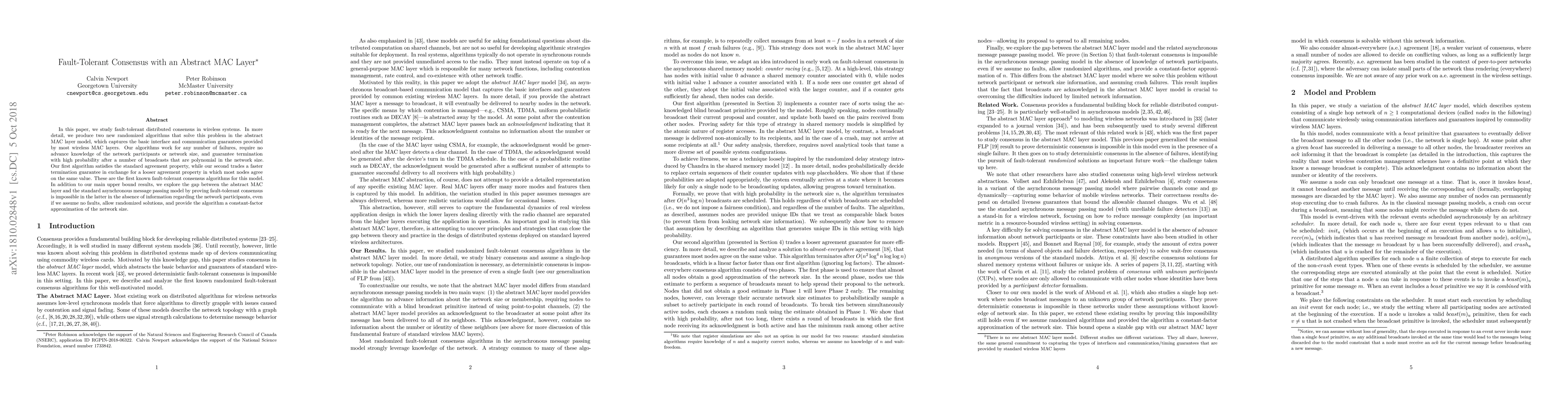 This paper introduces two randomized algorithms for fault-tolerant consensus in wireless systems under the abstract MAC layer model, which ensures termination with high probability after polynomial broadcasts. The first algorithm guarantees standard agreement, while the second offers faster termination for most nodes agreeing on the same value.