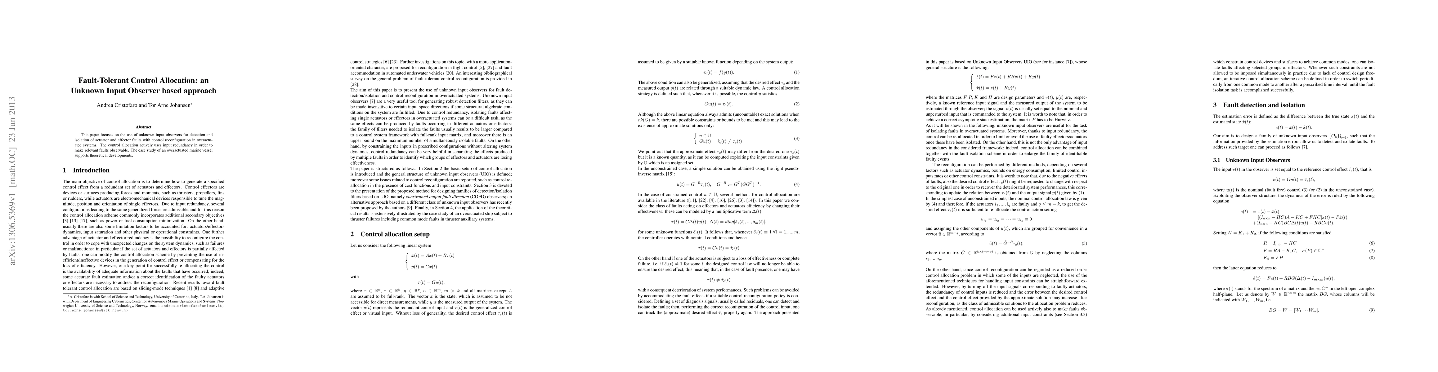 This paper focuses on the use of unknown input observers for detection and isolation of actuator and effector faults with control reconfiguration in overactuated systems. The control allocation actively uses input redundancy in order to make relevant faults observable. The case study of an overactuated marine vessel supports theoretical developments.