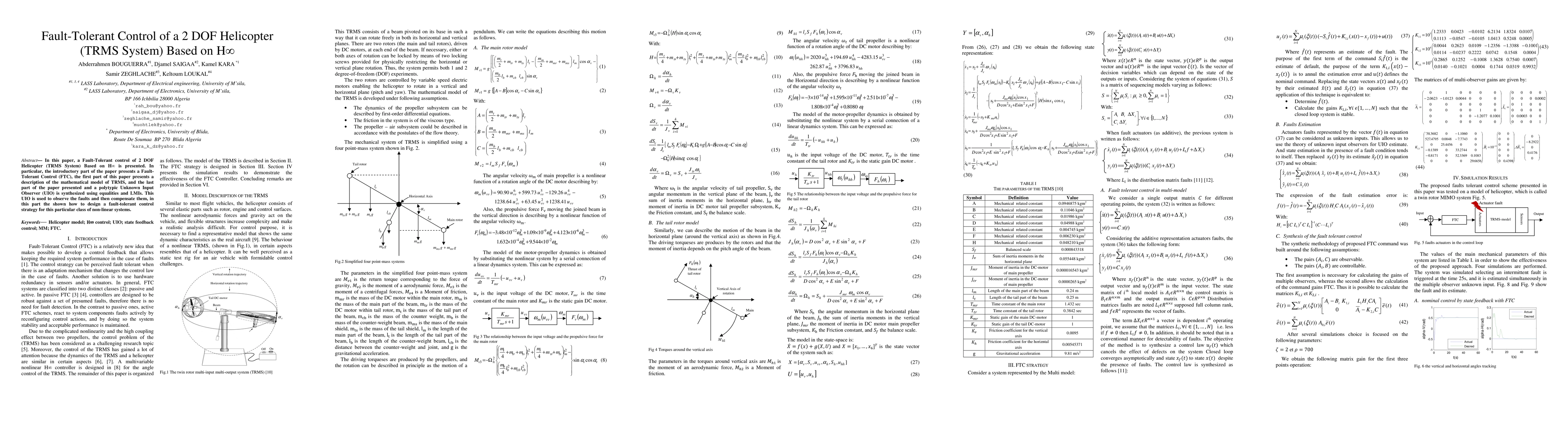 In this paper, a Fault-Tolerant control of 2 DOF Helicopter (TRMS System) Based on H-infinity is presented. In particular, the introductory part of the paper presents a Fault-Tolerant Control (FTC), the first part of this paper presents a description of the mathematical model of TRMS, and the last part of the paper presented and a polytypic Unknown Input Observer (UIO) is synthesized using equalities and LMIs. This UIO is used to observe the faults and then compensate them, in this part the shown how to design a fault-tolerant control strategy for this particular class of non-linear systems.