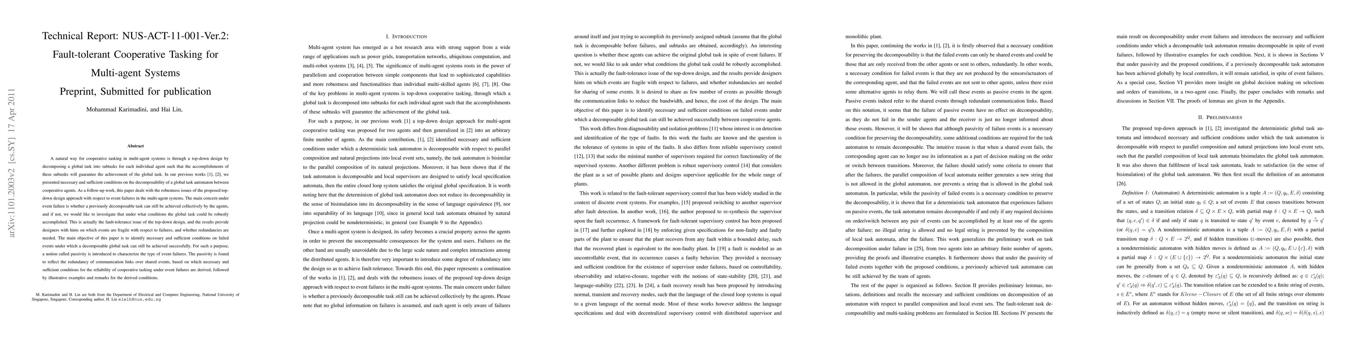 A natural way for cooperative tasking in multi-agent systems is through a top-down design by decomposing a global task into sub-tasks for each individual agent such that the accomplishments of these sub-tasks will guarantee the achievement of the global task. In our previous works [1], [2] we presented necessary and sufficient conditions on the decomposability of a global task automaton between cooperative agents. As a follow-up work, this paper deals with the robustness issues of the proposed top-down design approach with respect to event failures in the multi-agent systems. The main concern under event failure is whether a previously decomposable task can still be achieved collectively by the agents, and if not, we would like to investigate that under what conditions the global task could be robustly accomplished. This is actually the fault-tolerance issue of the top-down design, and the results provide designers with hints on which events are fragile with respect to failures, and whether redundancies are needed. The main objective of this paper is to identify necessary and sufficient conditions on failed events under which a decomposable global task can still be achieved successfully. For such a purpose, a notion called passivity is introduced to characterize the type of event failures. The passivity is found to reflect the redundancy of communication links over shared events, based on which necessary and sufficient conditions for the reliability of cooperative tasking under event failures are derived, followed by illustrative examples and remarks for the derived conditions.