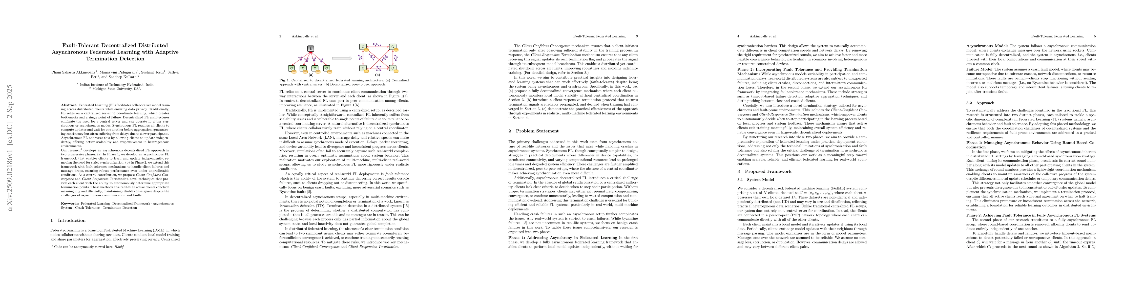 Federated Learning (FL) facilitates collaborative model training across distributed clients while ensuring data privacy. Traditionally, FL relies on a centralized server to coordinate learning, which creates bottlenecks and a single point of failure. Decentralized FL architectures eliminate the need for a central server and can operate in either synchronous or asynchronous modes. Synchronous FL requires all clients to compute updates and wait for one another before aggregation, guaranteeing consistency but often suffering from delays due to slower participants. Asynchronous FL addresses this by allowing clients to update independently, offering better scalability and responsiveness in heterogeneous environments. Our research develops an asynchronous decentralized FL approach in two progressive phases. (a) In Phase 1, we develop an asynchronous FL framework that enables clients to learn and update independently, removing the need for strict synchronization. (b) In Phase 2, we extend this framework with fault tolerance mechanisms to handle client failures and message drops, ensuring robust performance even under unpredictable conditions. As a central contribution, we propose Client-Confident Convergence and Client-Responsive Termination novel techniques that provide each client with the ability to autonomously determine appropriate termination points. These methods ensure that all active clients conclude meaningfully and efficiently, maintaining reliable convergence despite the challenges of asynchronous communication and faults.