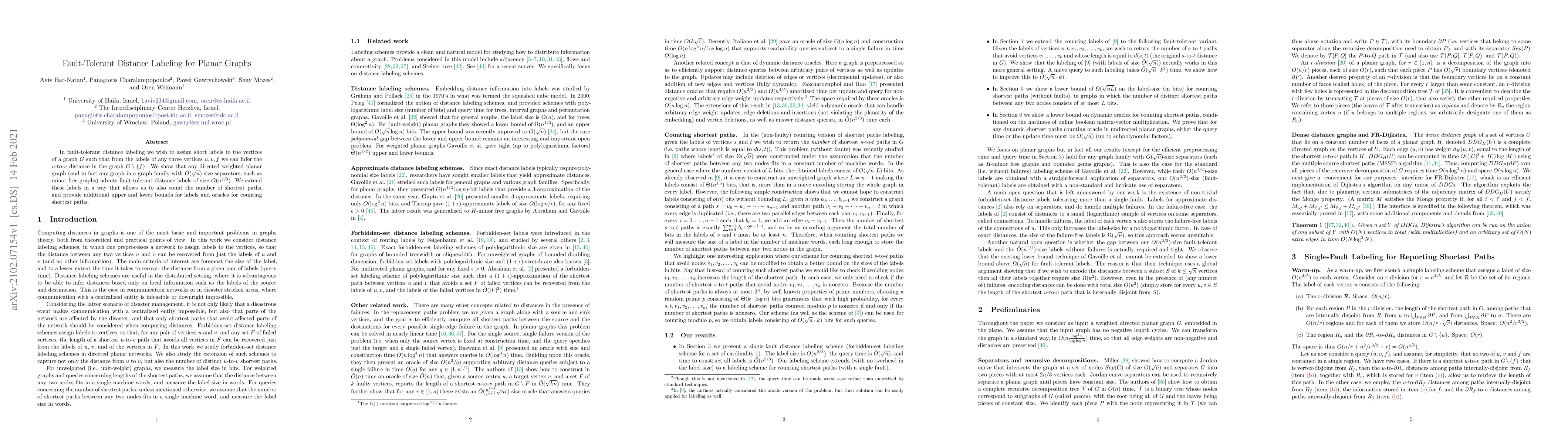 This paper presents a method for fault-tolerant distance labeling in planar graphs, where short labels are assigned to vertices to infer distances even when one vertex is removed. It demonstrates that such labels can be of size $O(n^{2/3})$ for directed weighted planar graphs and minor-free graphs. The study also extends the labels to count the number of shortest paths and provides bounds for both labels and path-counting oracles.