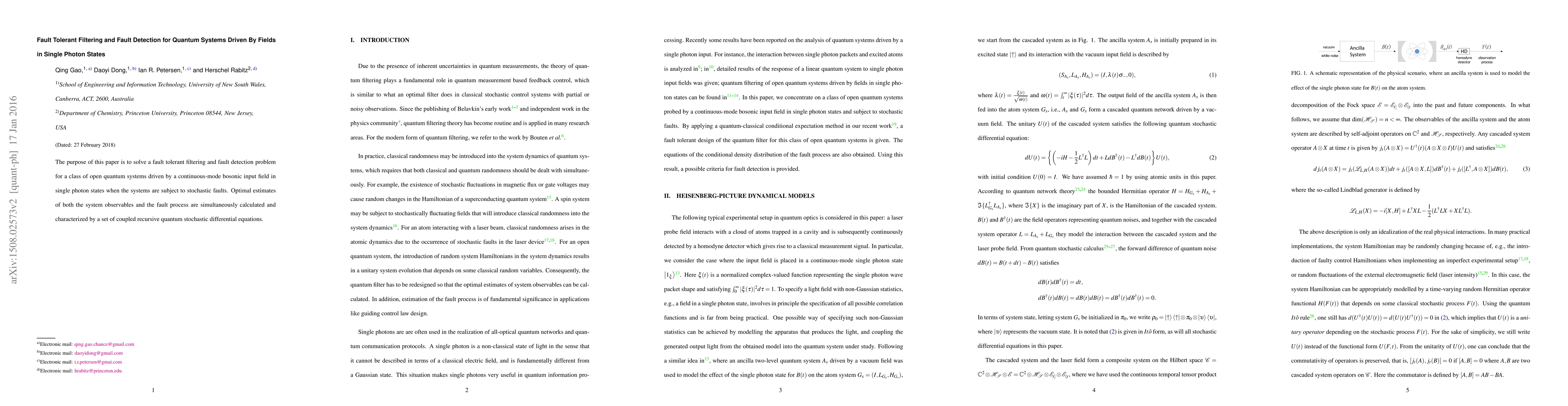 This paper addresses fault tolerant filtering and detection for quantum systems driven by single photon states, proposing optimal estimates for system observables and fault processes through coupled recursive quantum stochastic differential equations.