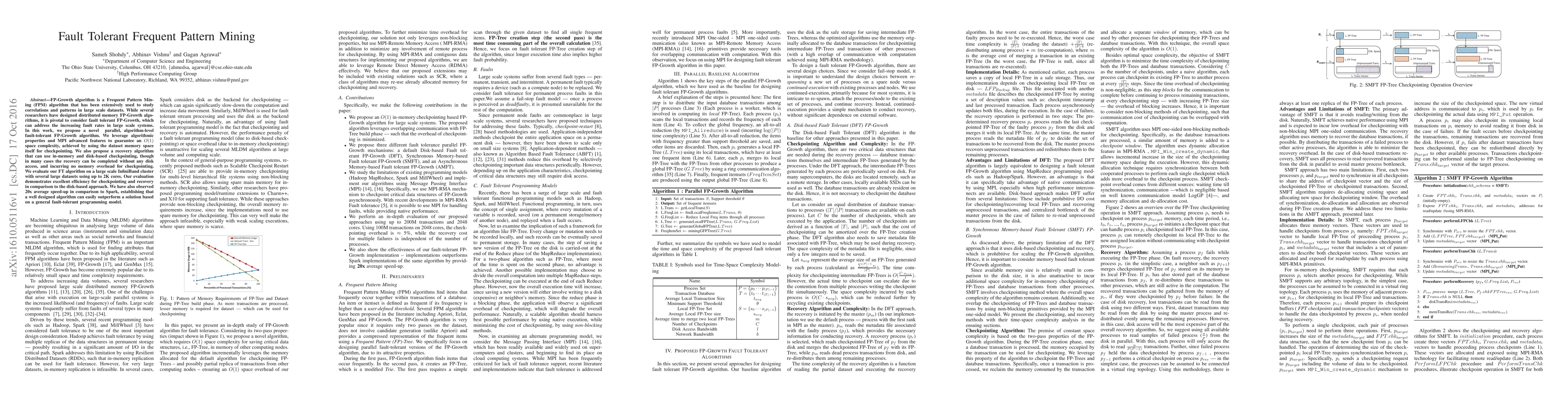This paper proposes a novel parallel, fault-tolerant FP-Growth algorithm to handle increasing fault rates in large-scale systems. The algorithm leverages MPI features for O(1) space complexity and efficient checkpointing, achieving significant speed-ups over Spark and demonstrating efficient recovery with minimal disk access.