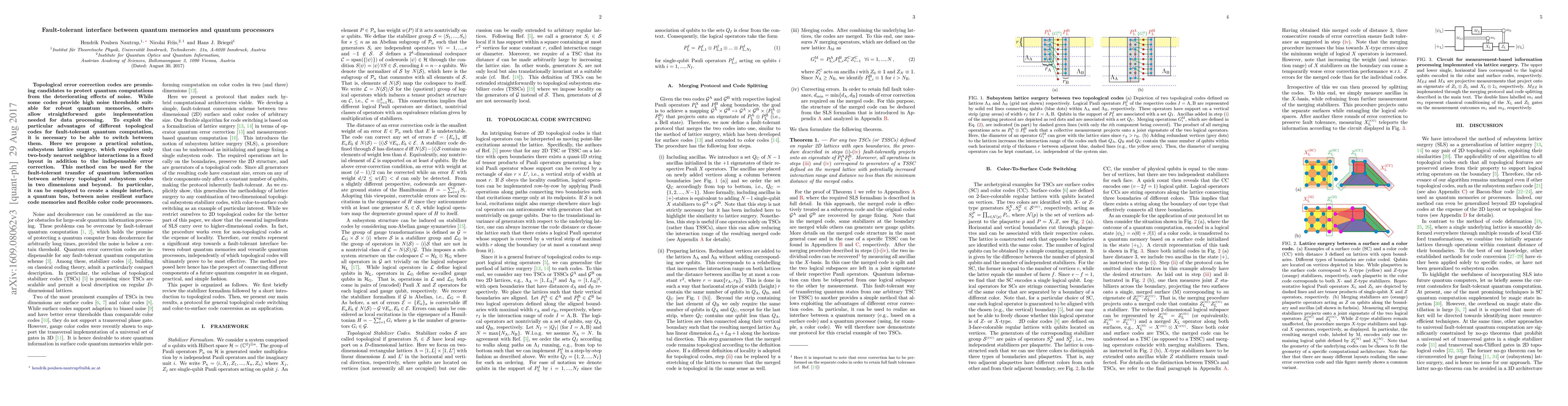 This paper proposes a subsystem lattice surgery method for a fault-tolerant interface between quantum memories and processors, enabling seamless transfer between different topological error correction codes using only two-body nearest neighbor interactions. This interface, or quantum bus, can connect noise-resistant surface code memories with versatile color code processors.