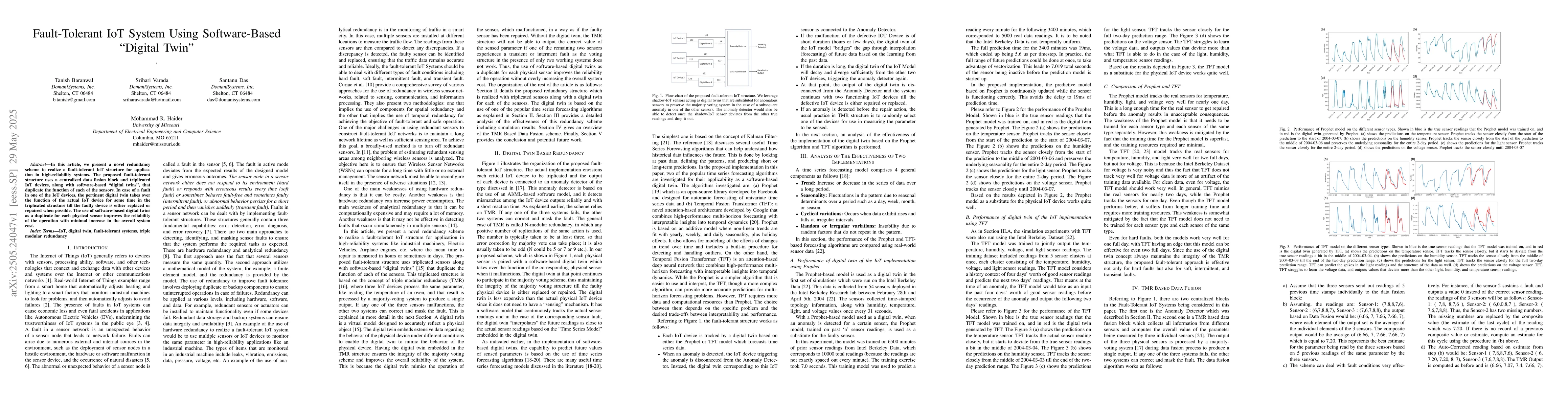 The research presents a novel redundancy scheme for a fault-tolerant IoT structure, utilizing a centralized data fusion block, triplicated IoT devices, and software-based 'digital twins' to duplicate sensor functions.