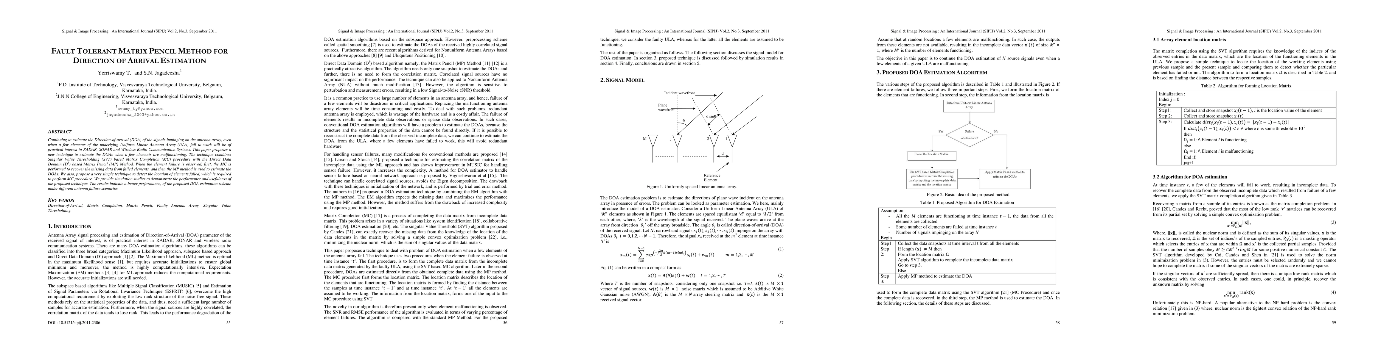 This paper proposes a fault-tolerant method combining Singular Value Thresholding based Matrix Completion and Direct Data Domain Matrix Pencil for estimating Direction-of-Arrival in scenarios with antenna array element failures, demonstrating improved performance through simulations.