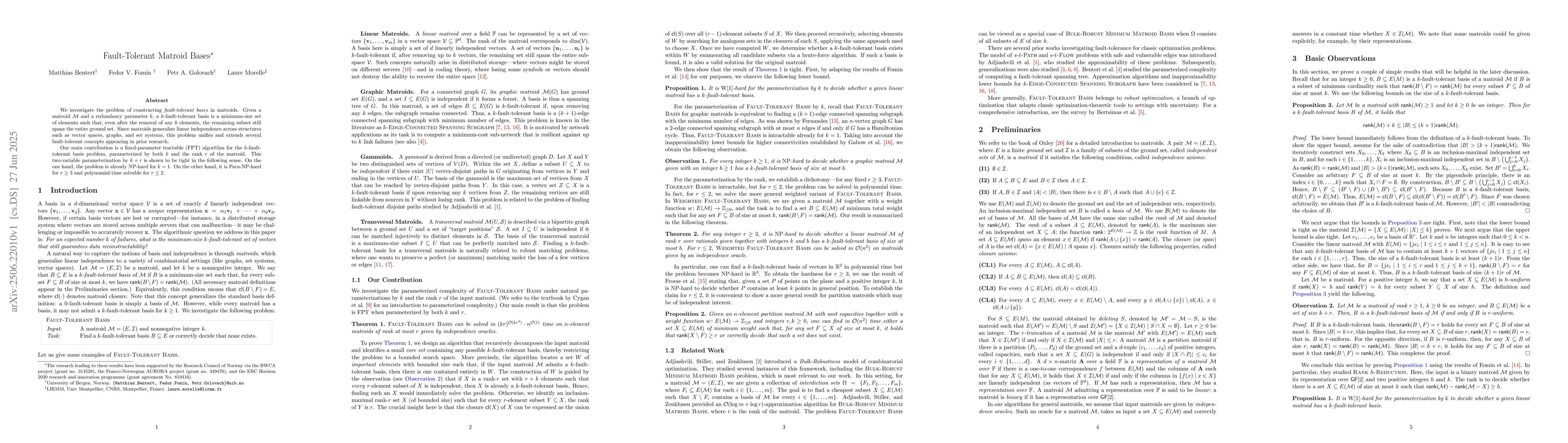 The research investigates fault-tolerant bases in matroids, presenting an FPT algorithm for the k-fault-tolerant basis problem parameterized by both k and the rank r of the matroid, with a two-variable parameterization by k + r shown to be tight.