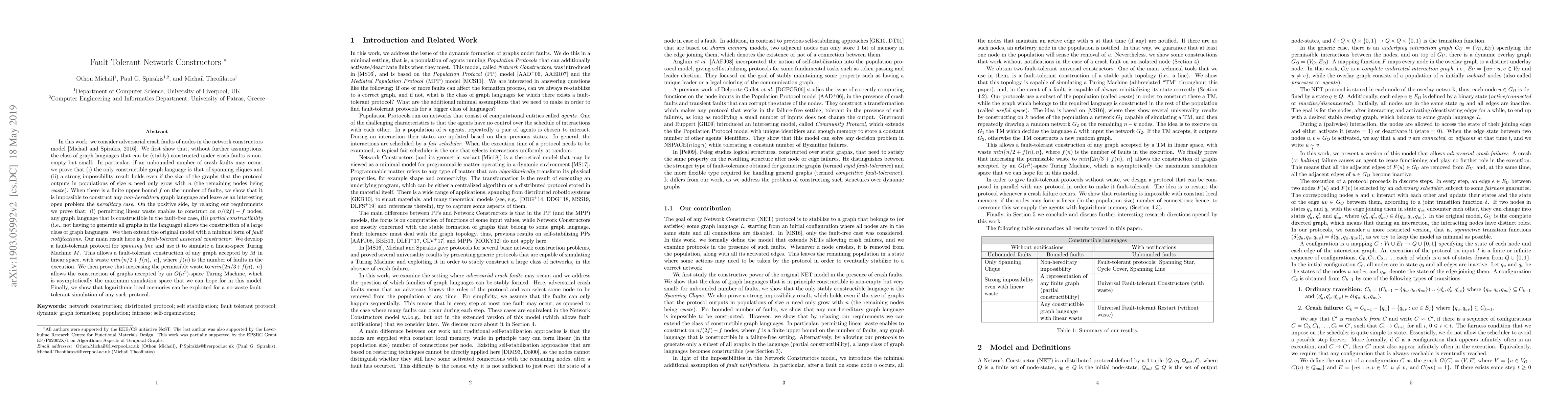 The paper presents novel theoretical results on the constructibility of graph languages under crash faults, introducing a fault-tolerant universal constructor capable of simulating a Turing Machine with linear space complexity and controlled waste.
