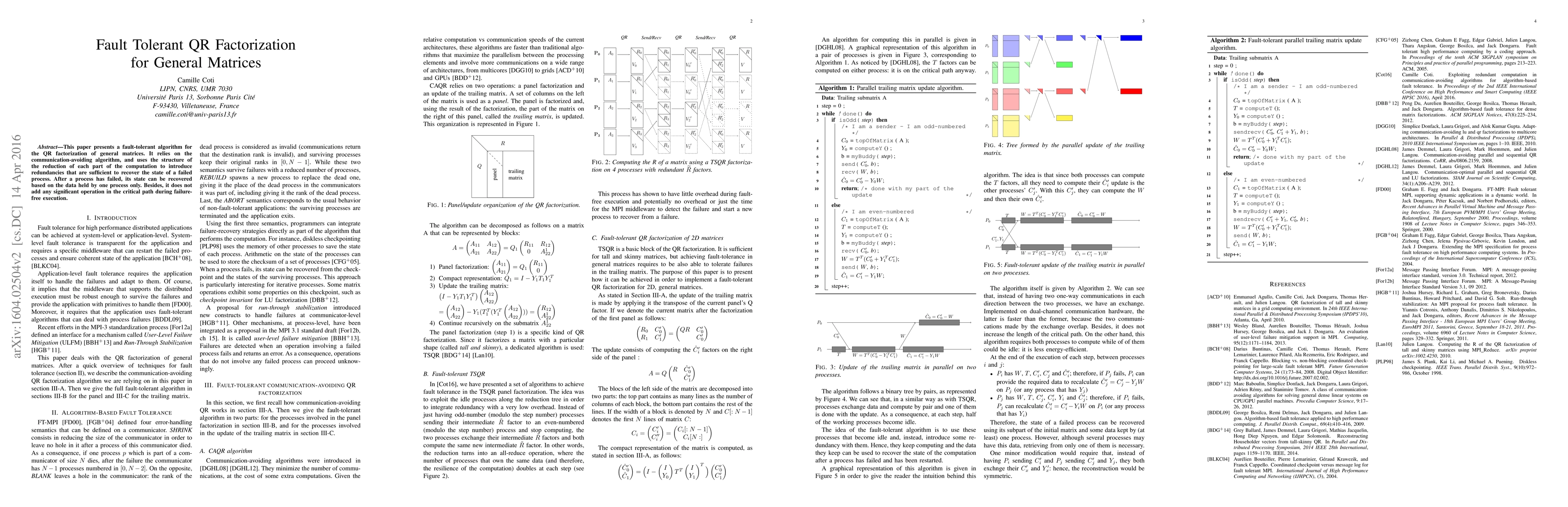 This paper introduces a fault-tolerant QR factorization algorithm for general matrices that leverages a communication-avoiding approach, incorporating redundancies to recover from failed processes without impacting the critical path during normal execution.