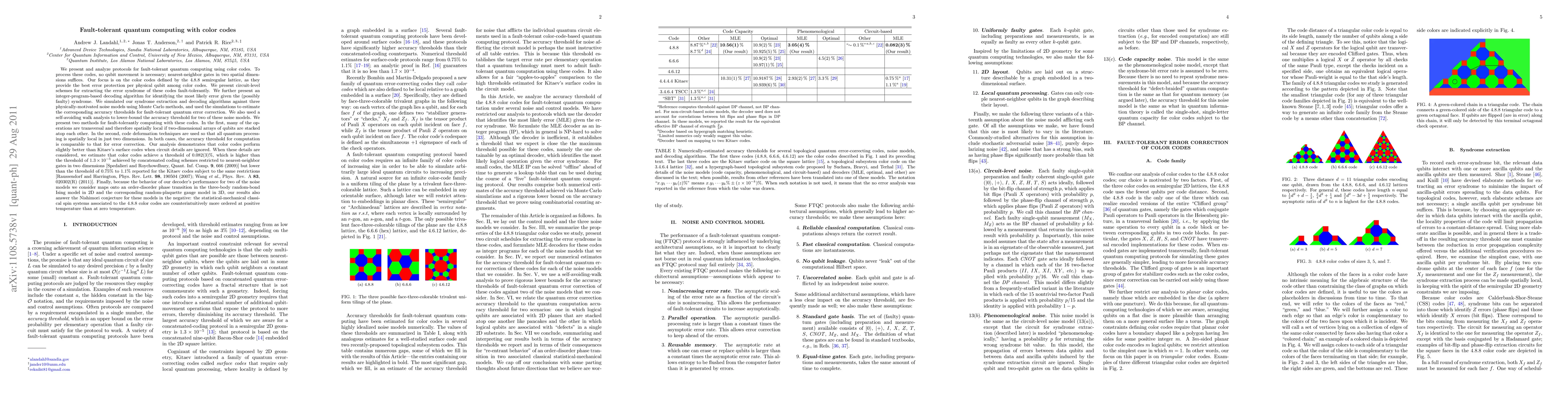 We present and analyze protocols for fault-tolerant quantum computing using color codes. We present circuit-level schemes for extracting the error syndrome of these codes fault-tolerantly. We further present an integer-program-based decoding algorithm for identifying the most likely error given the syndrome. We simulated our syndrome extraction and decoding algorithms against three physically-motivated noise models using Monte Carlo methods, and used the simulations to estimate the corresponding accuracy thresholds for fault-tolerant quantum error correction. We also used a self-avoiding walk analysis to lower-bound the accuracy threshold for two of these noise models. We present and analyze two architectures for fault-tolerantly computing with these codes: one with 2D arrays of qubits are stacked atop each other and one in a single 2D substrate. Our analysis demonstrates that color codes perform slightly better than Kitaev's surface codes when circuit details are ignored. When these details are considered, we estimate that color codes achieve a threshold of 0.082(3)%, which is higher than the threshold of $1.3 \times 10^{-5}$ achieved by concatenated coding schemes restricted to nearest-neighbor gates in two dimensions but lower than the threshold of 0.75% to 1.1% reported for the Kitaev codes subject to the same restrictions. Finally, because the behavior of our decoder's performance for two of the noise models we consider maps onto an order-disorder phase transition in the three-body random-bond Ising model in 2D and the corresponding random-plaquette gauge model in 3D, our results also answer the Nishimori conjecture for these models in the negative: the statistical-mechanical classical spin systems associated to the 4.8.8 color codes are counterintuitively more ordered at positive temperature than at zero temperature.