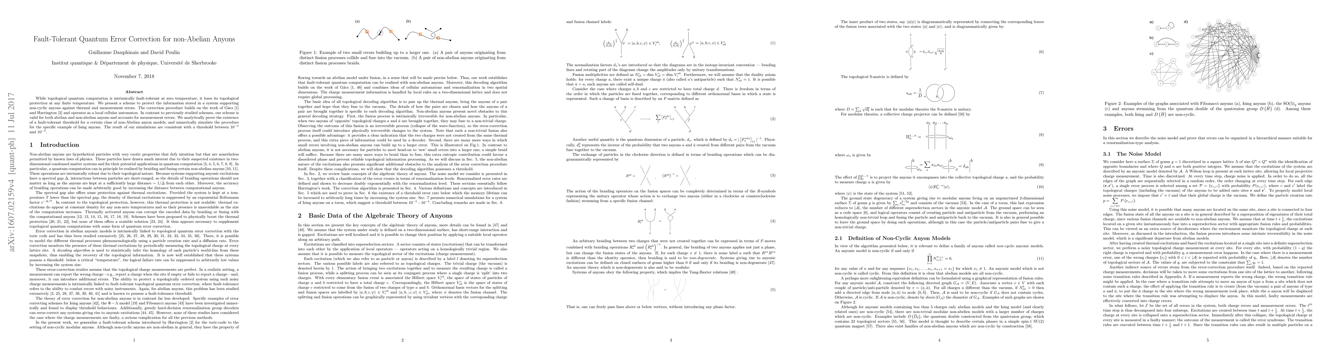 This paper proposes a fault-tolerant quantum error correction scheme for non-Abelian anyons, combining cellular automaton techniques with analytical and numerical methods to demonstrate a threshold for error correction, proving its effectiveness against thermal and measurement errors, and achieving results consistent with a threshold between $10^{-4}$ and $10^{-3}$.