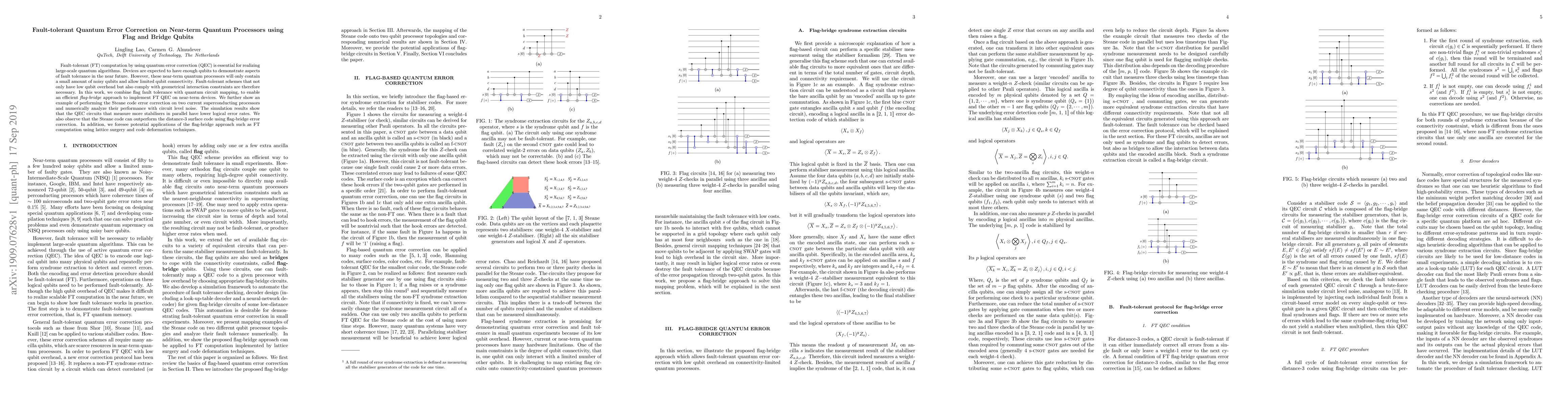 This paper presents a fault-tolerant quantum error correction (QEC) scheme using flag and bridge qubits to implement efficient QEC on near-term quantum processors with limited qubit connectivity and high noise levels. The proposed flag-bridge approach demonstrates lower logical error rates and potential advantages over the distance-3 surface code.