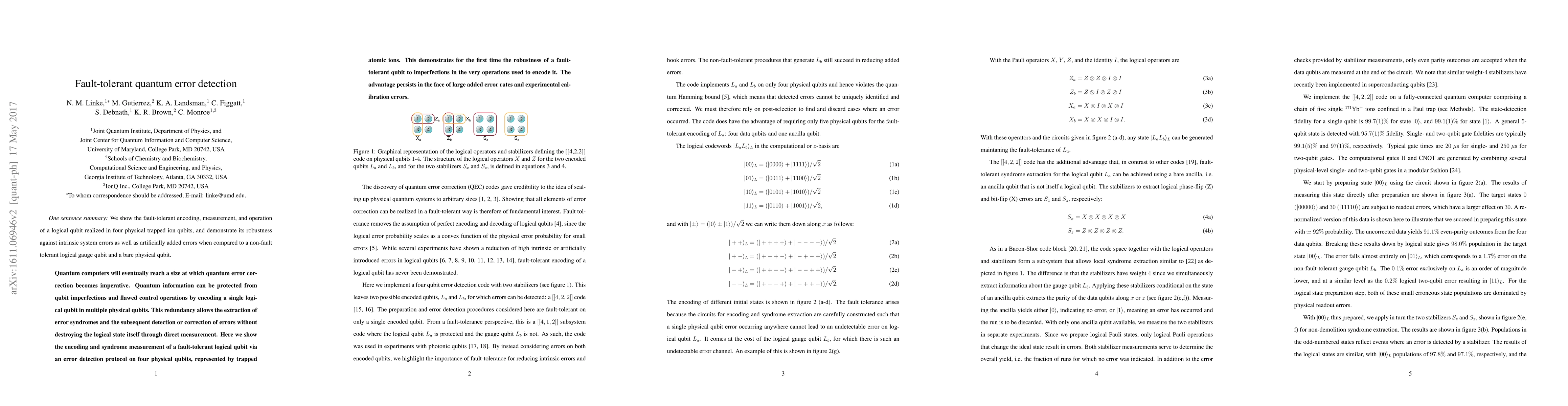 This paper presents a fault-tolerant quantum error detection protocol using trapped atomic ions to demonstrate the robustness of a logical qubit encoded across multiple physical qubits, allowing error syndrome extraction and correction without destroying the logical state. The protocol shows resilience against high error rates and calibration errors, marking a significant step towards practical quantum computing.