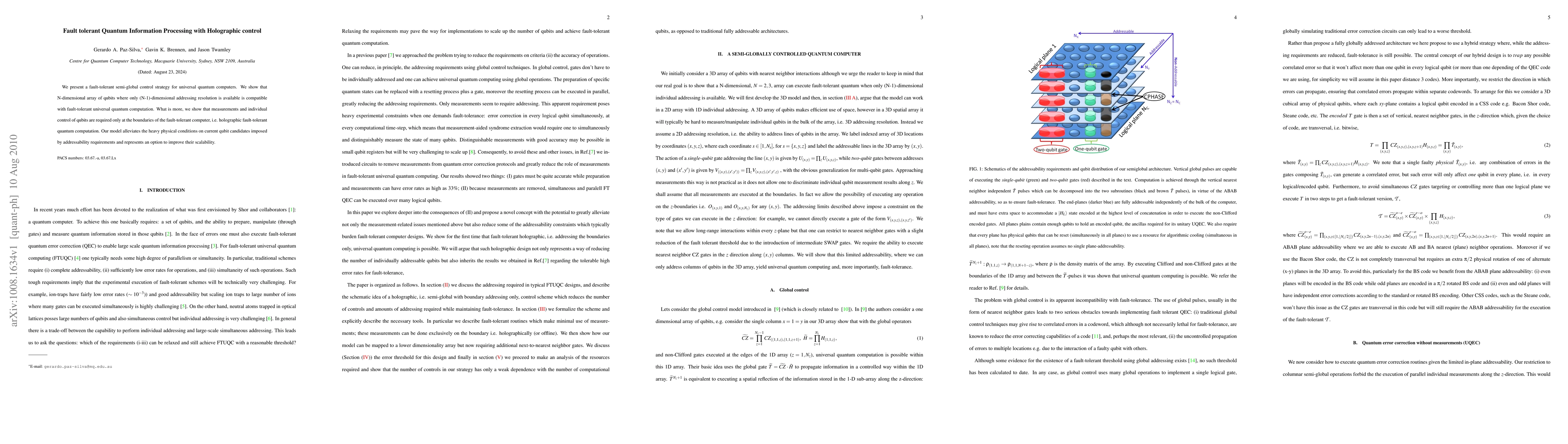 We present a fault-tolerant semi-global control strategy for universal quantum computers. We show that N-dimensional array of qubits where only (N-1)-dimensional addressing resolution is available is compatible with fault-tolerant universal quantum computation. What is more, we show that measurements and individual control of qubits are required only at the boundaries of the fault-tolerant computer, i.e. holographic fault-tolerant quantum computation. Our model alleviates the heavy physical conditions on current qubit candidates imposed by addressability requirements and represents an option to improve their scalability.