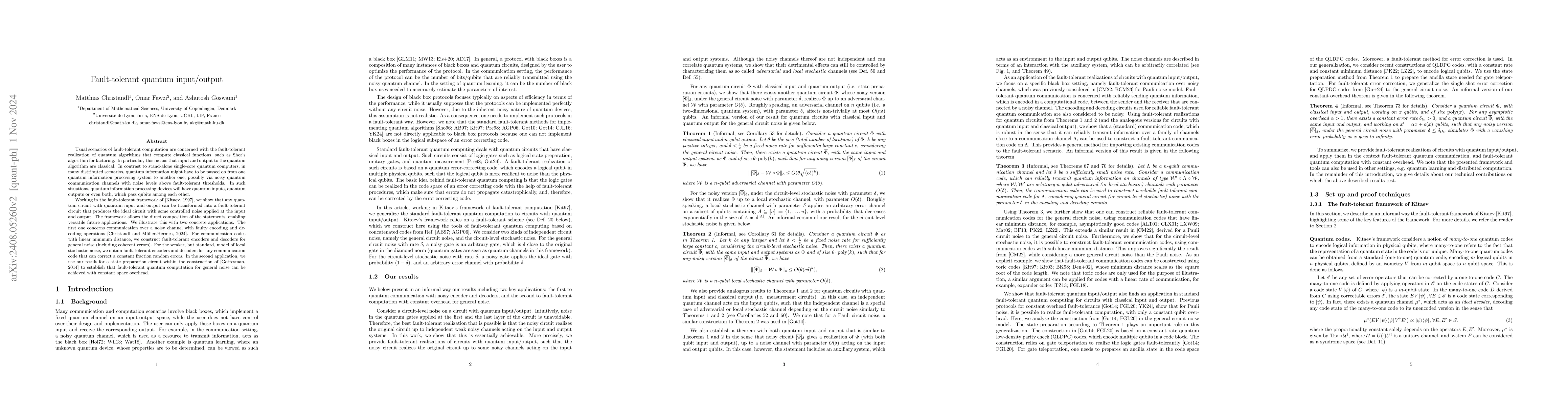 Usual scenarios of fault-tolerant computation are concerned with the fault-tolerant realization of quantum algorithms that compute classical functions, such as Shor's algorithm for factoring. In particular, this means that input and output to the quantum algorithm are classical. In contrast to stand-alone single-core quantum computers, in many distributed scenarios, quantum information might have to be passed on from one quantum information processing system to another one, possibly via noisy quantum communication channels with noise levels above fault-tolerant thresholds. In such situations, quantum information processing devices will have quantum inputs, quantum outputs or even both, which pass qubits among each other. Working in the fault-tolerant framework of [Kitaev, 1997], we show that any quantum circuit with quantum input and output can be transformed into a fault-tolerant circuit that produces the ideal circuit with some controlled noise applied at the input and output. The framework allows the direct composition of the statements, enabling versatile future applications. We illustrate this with two concrete applications. The first one concerns communication over a noisy channel with faulty encoding and decoding operations [Christandl and M{\"u}ller-Hermes, 2024]. For communication codes with linear minimum distance, we construct fault-tolerant encoders and decoders for general noise (including coherent errors). For the weaker, but standard, model of local stochastic noise, we obtain fault-tolerant encoders and decoders for any communication code that can correct a constant fraction random errors. In the second application, we use our result for a state preparation circuit within the construction of [Gottesman, 2014] to establish that fault-tolerant quantum computation for general noise can be achieved with constant space overhead.