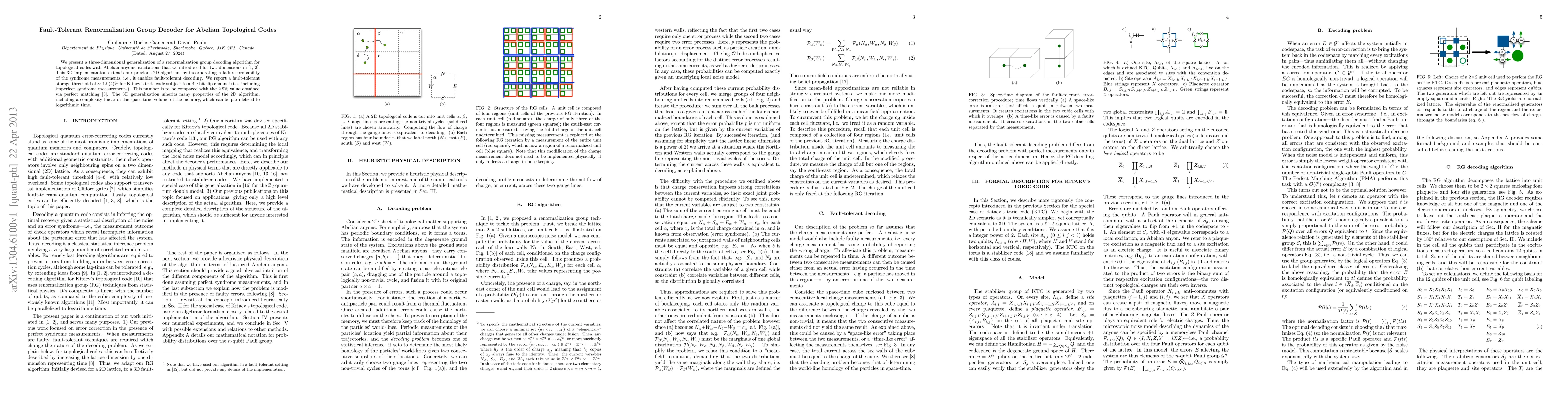 This paper introduces a fault-tolerant renormalization group decoder for 3D topological codes with Abelian anyonic excitations, extending a previously successful 2D algorithm. It reports a storage threshold of 1.9(4)% for Kitaev's toric code under a 3D bit-flip channel, demonstrating improved fault tolerance compared to perfect matching.