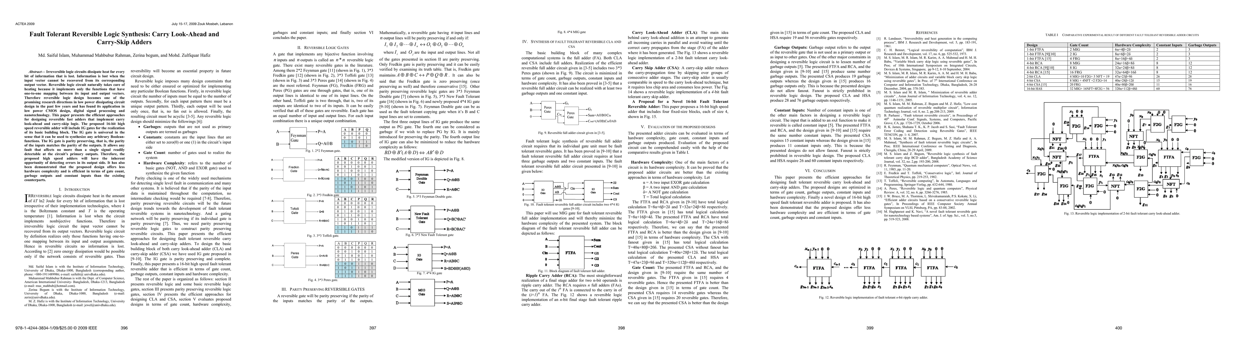 This paper explores efficient reversible logic synthesis for fault-tolerant fast adders, proposing a 16-bit high-speed design using IG gates. The IG gate preserves input parity, allowing single fault detection, leading to lower hardware complexity and fewer garbage outputs compared to traditional methods.