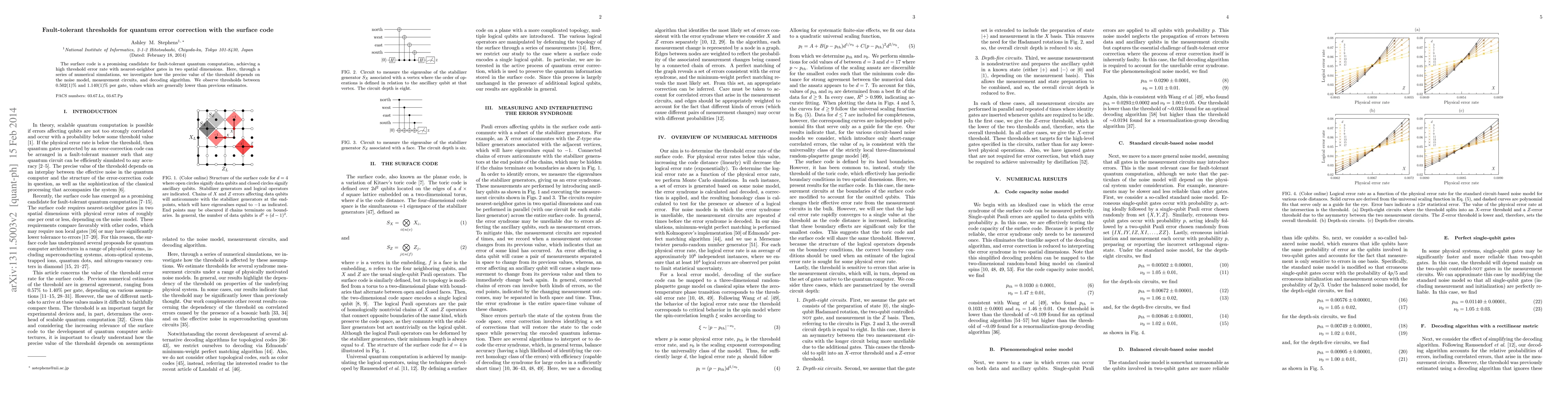 This paper investigates the fault-tolerant threshold for the surface code in quantum error correction, finding thresholds between 0.502(1)% and 1.140(1)% per gate through numerical simulations, which are lower than previous estimates. The study considers various noise models, measurement circuits, and decoding algorithms.