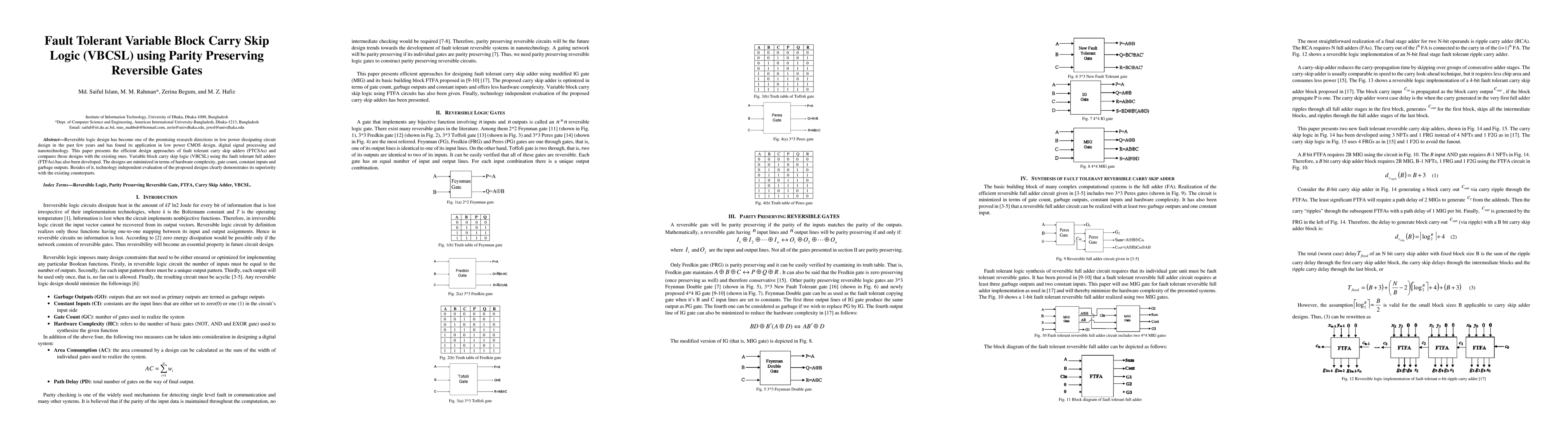 This paper proposes efficient fault tolerant variable block carry skip logic (VBCSL) designs using parity preserving reversible gates for low power circuits. The designs minimize hardware complexity and demonstrate superior performance compared to existing fault tolerant carry skip adders (FTCSAs).