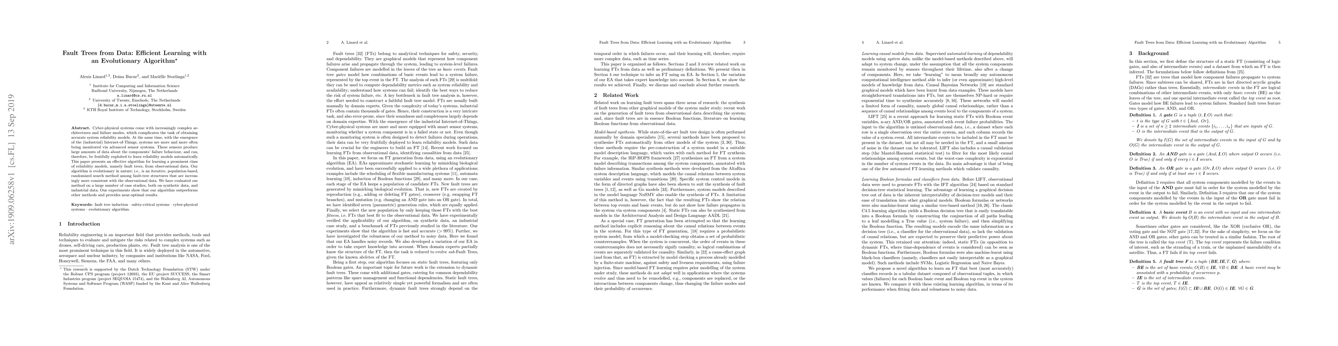 This paper presents an evolutionary algorithm for efficiently learning fault trees from observational data to model the reliability of complex cyber-physical systems. The algorithm outperforms other methods in both synthetic and industrial data evaluations, demonstrating near-optimal results.