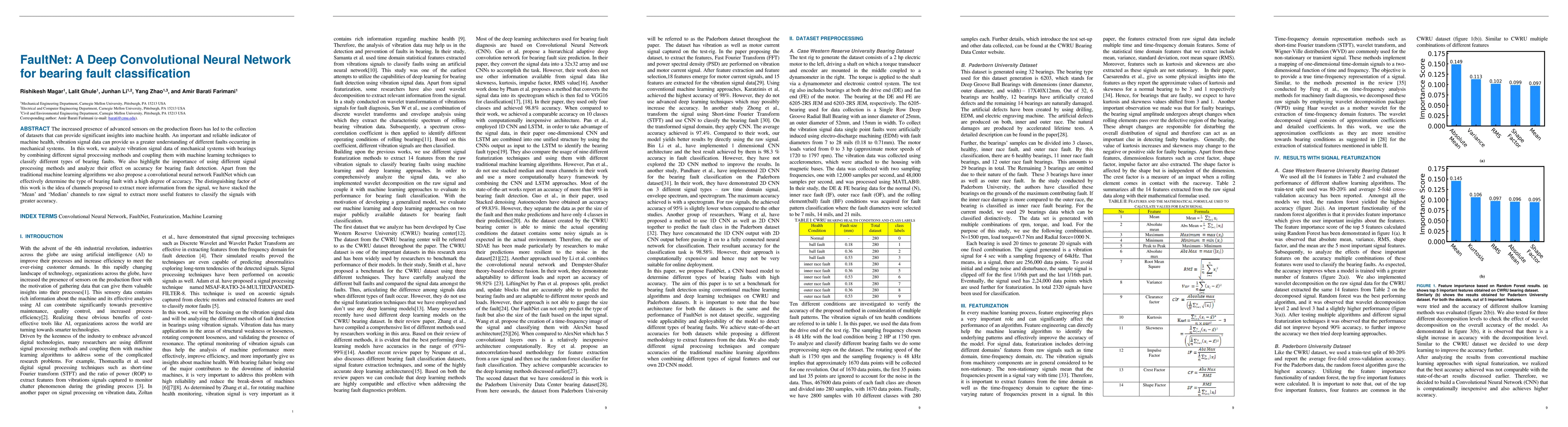 This paper proposes FaultNet, a deep convolutional neural network for classifying bearing faults using vibration signal data. It combines signal processing methods with machine learning to enhance fault detection accuracy, emphasizing the importance of additional channels like Mean and Median for feature extraction.