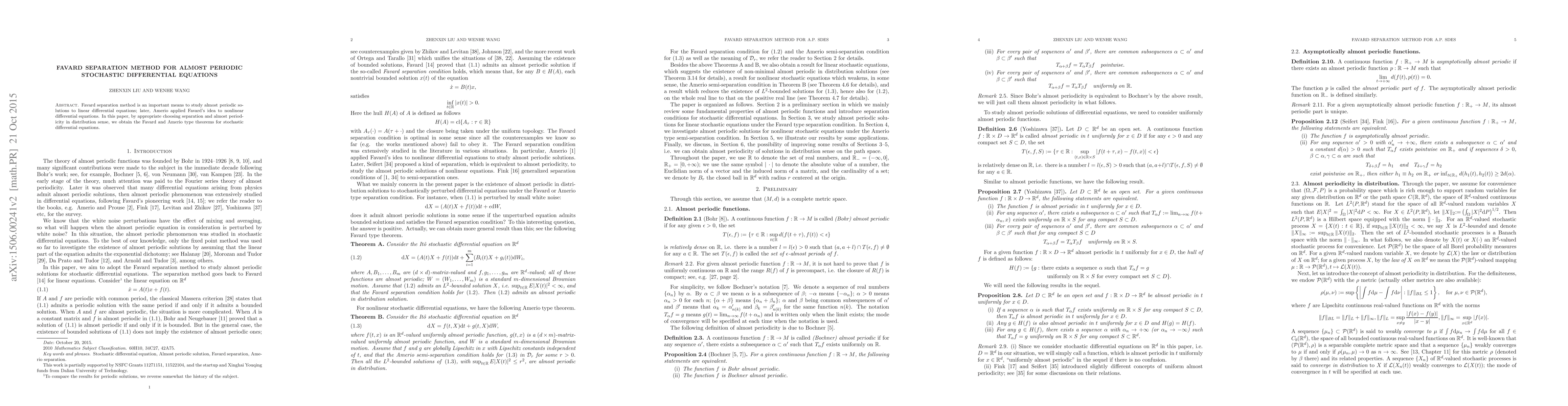 This paper extends the Favard separation method to stochastic differential equations, establishing Favard and Amerio type theorems for almost periodic solutions in a stochastic context by leveraging appropriate separation and almost periodicity in distribution sense.