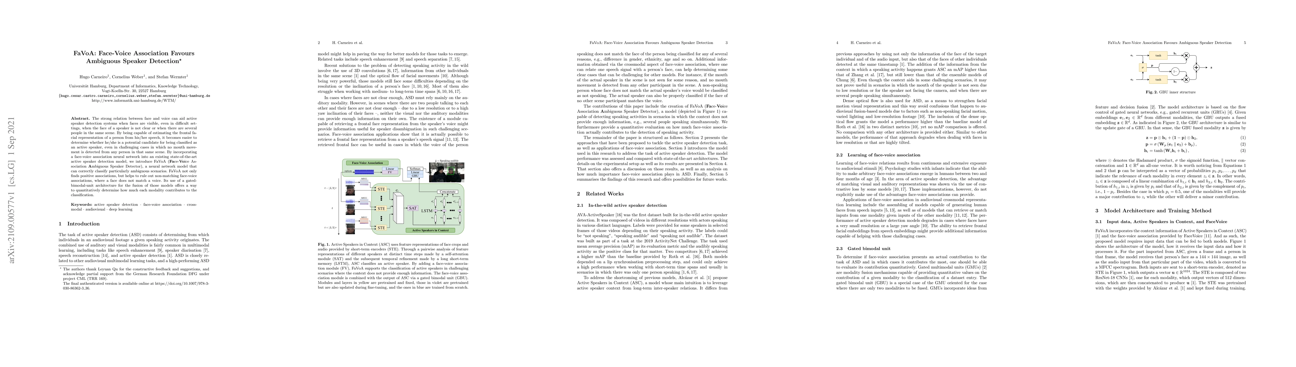 The strong relation between face and voice can aid active speaker detection systems when faces are visible, even in difficult settings, when the face of a speaker is not clear or when there are several people in the same scene. By being capable of estimating the frontal facial representation of a person from his/her speech, it becomes easier to determine whether he/she is a potential candidate for being classified as an active speaker, even in challenging cases in which no mouth movement is detected from any person in that same scene. By incorporating a face-voice association neural network into an existing state-of-the-art active speaker detection model, we introduce FaVoA (Face-Voice Association Ambiguous Speaker Detector), a neural network model that can correctly classify particularly ambiguous scenarios. FaVoA not only finds positive associations, but helps to rule out non-matching face-voice associations, where a face does not match a voice. Its use of a gated-bimodal-unit architecture for the fusion of those models offers a way to quantitatively determine how much each modality contributes to the classification.
