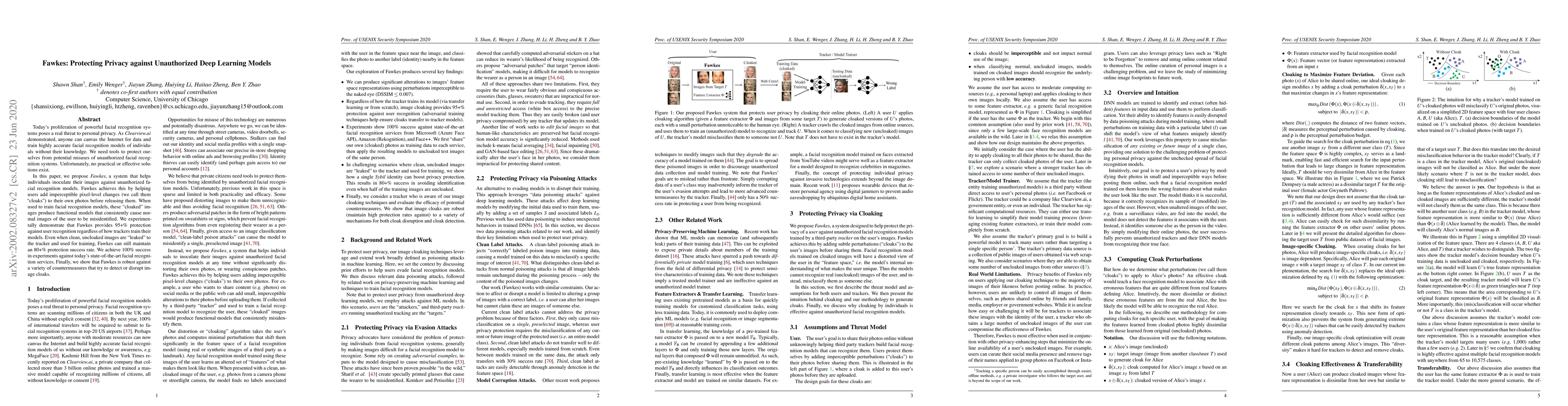 Today's proliferation of powerful facial recognition systems poses a real threat to personal privacy. As Clearview.ai demonstrated, anyone can canvas the Internet for data and train highly accurate facial recognition models of individuals without their knowledge. We need tools to protect ourselves from potential misuses of unauthorized facial recognition systems. Unfortunately, no practical or effective solutions exist. In this paper, we propose Fawkes, a system that helps individuals inoculate their images against unauthorized facial recognition models. Fawkes achieves this by helping users add imperceptible pixel-level changes (we call them "cloaks") to their own photos before releasing them. When used to train facial recognition models, these "cloaked" images produce functional models that consistently cause normal images of the user to be misidentified. We experimentally demonstrate that Fawkes provides 95+% protection against user recognition regardless of how trackers train their models. Even when clean, uncloaked images are "leaked" to the tracker and used for training, Fawkes can still maintain an 80+% protection success rate. We achieve 100% success in experiments against today's state-of-the-art facial recognition services. Finally, we show that Fawkes is robust against a variety of countermeasures that try to detect or disrupt image cloaks.