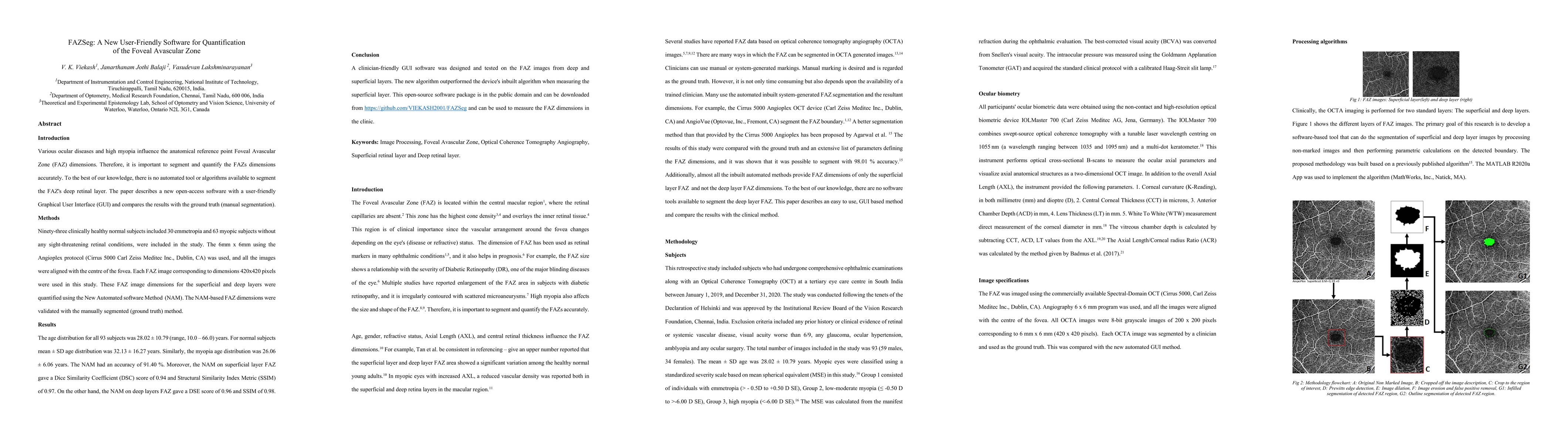 A new software tool called FAZSeg has been developed to accurately measure the Foveal Avascular Zone's dimensions in ocular diseases and high myopia. The tool uses a user-friendly interface and compares its results with manual segmentation for validation.
