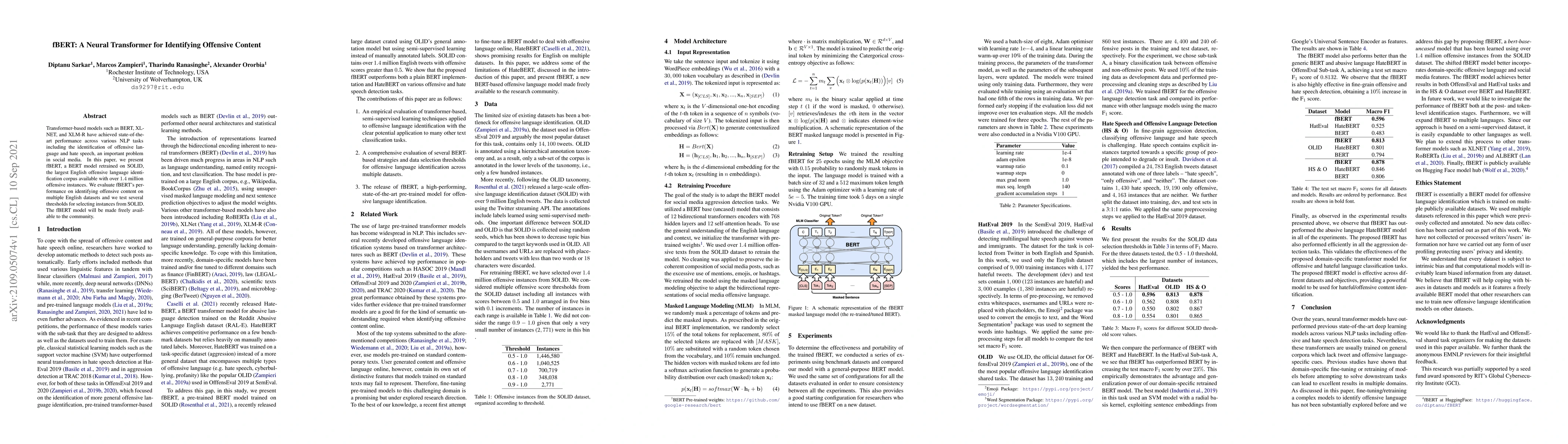 This paper introduces fBERT, a specialized BERT model retrained on SOLID, a large corpus of offensive language, to enhance the identification of hate speech and offensive content in social media. The model's performance is evaluated across various datasets, and it will be made publicly available to the research community.