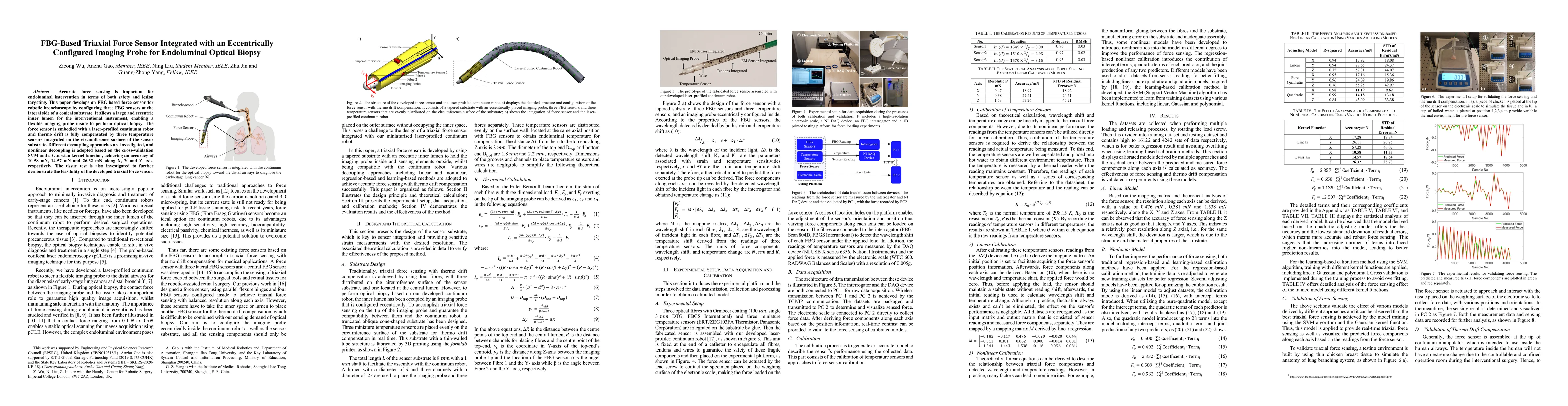 This paper presents an FBG-based triaxial force sensor integrated with an eccentrically configured imaging probe for endoluminal optical biopsy, achieving high accuracy in force sensing and compensating for thermo drift, validated through tissue tests. Nonlinear decoupling using SVM and Gaussian kernel function enhances the sensor's performance.