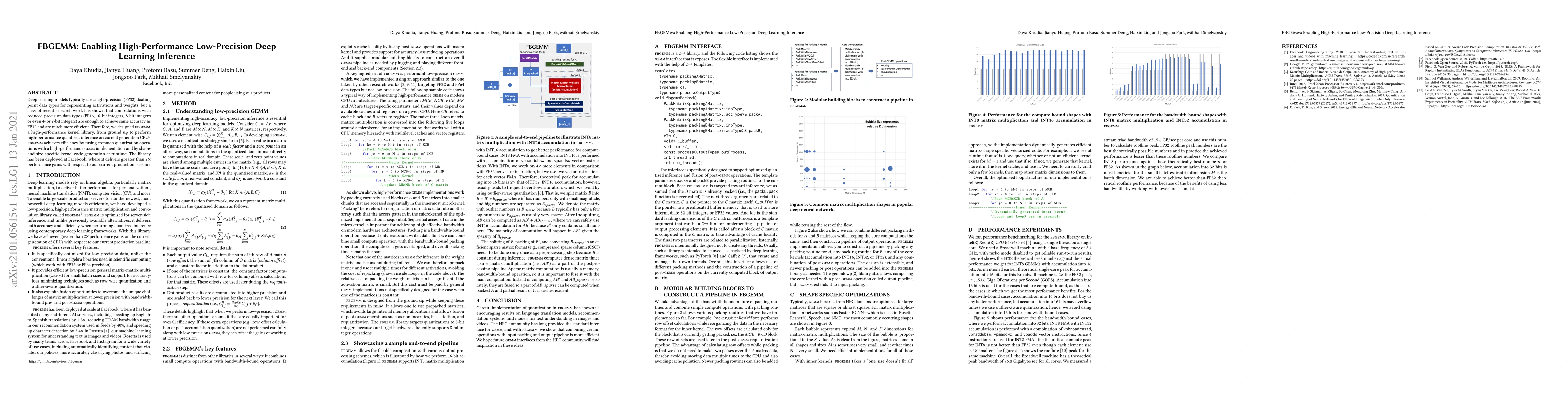 Title: FBGEMM: Enabling High-Performance Low-Precision Deep Learning Inference Summary: FBGEMM is a high-performance kernel library designed for efficient low-precision deep learning inference, achieving significant performance gains by fusing quantization operations with optimized GEMM implementations and runtime kernel generation.