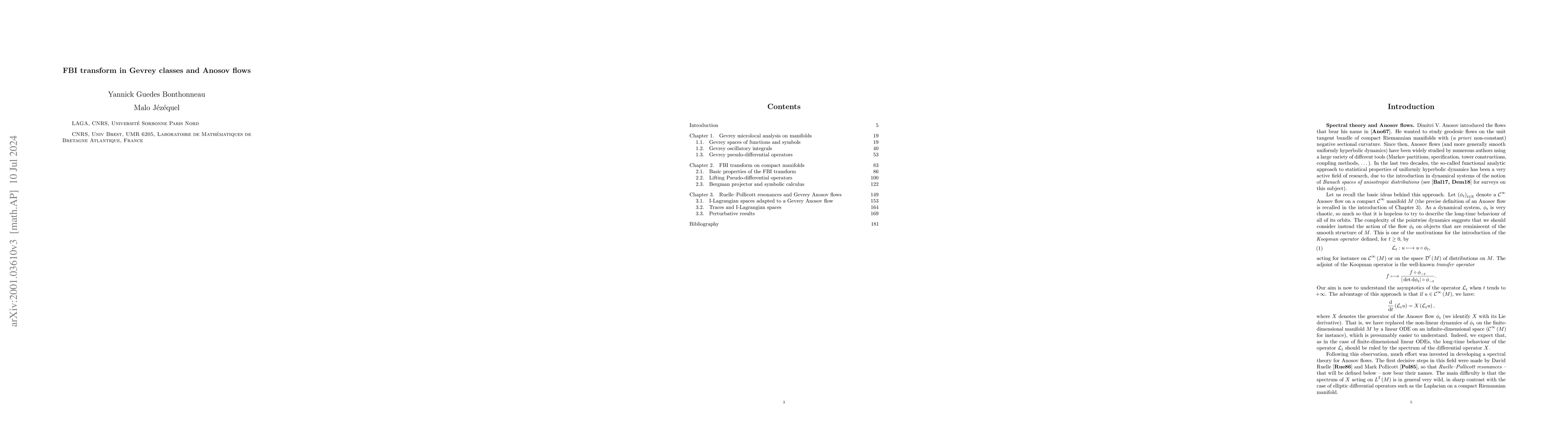 The paper constructs an analytic FBI transform on compact manifolds, facilitating the study of microlocal analytic and Gevrey regularity. This tool is applied to analyze the Ruelle spectrum of Anosov flows with Gevrey coefficients, proving finite order for the associated dynamical determinant.