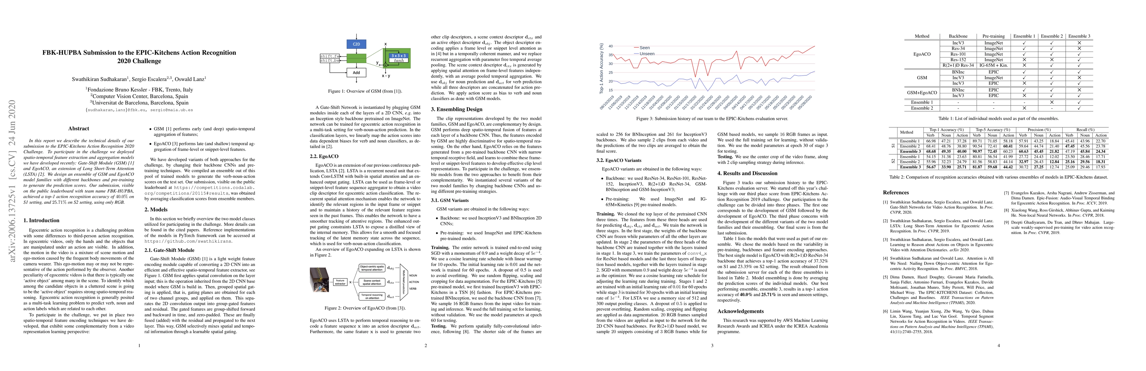 In this report we describe the technical details of our submission to the EPIC-Kitchens Action Recognition 2020 Challenge. To participate in the challenge we deployed spatio-temporal feature extraction and aggregation models we have developed recently: Gate-Shift Module (GSM) [1] and EgoACO, an extension of Long Short-Term Attention (LSTA) [2]. We design an ensemble of GSM and EgoACO model families with different backbones and pre-training to generate the prediction scores. Our submission, visible on the public leaderboard with team name FBK-HUPBA, achieved a top-1 action recognition accuracy of 40.0% on S1 setting, and 25.71% on S2 setting, using only RGB.