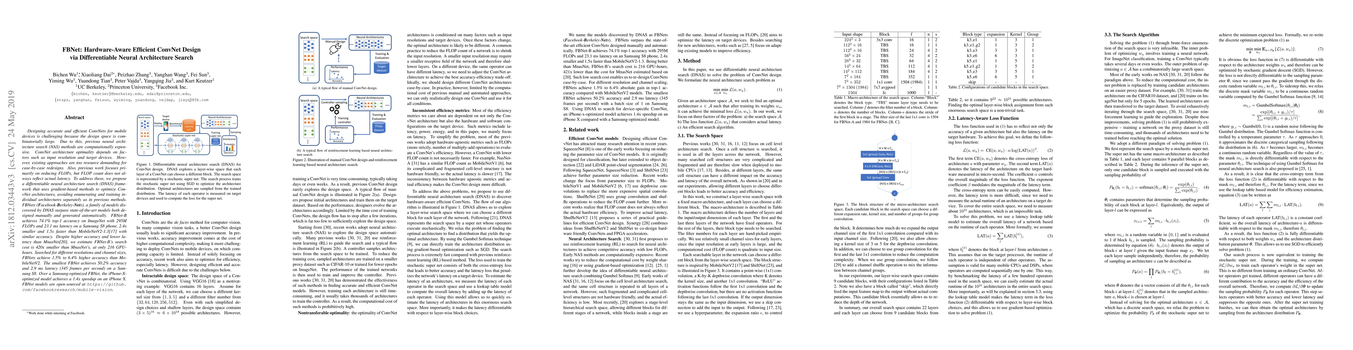 FBNet employs differentiable neural architecture search to design efficient ConvNets for mobile devices, optimizing both accuracy and latency. Compared to MobileNetV2, FBNet-B achieves higher accuracy with lower latency and significantly reduced search cost.