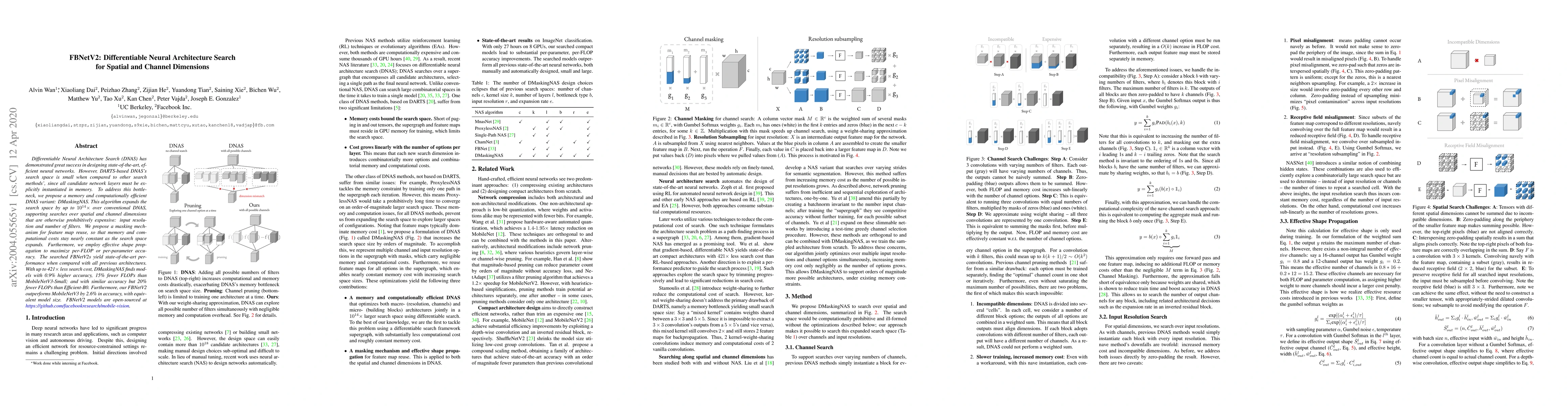 Differentiable Neural Architecture Search (DNAS) has demonstrated great success in designing state-of-the-art, efficient neural networks. However, DARTS-based DNAS's search space is small when compared to other search methods', since all candidate network layers must be explicitly instantiated in memory. To address this bottleneck, we propose a memory and computationally efficient DNAS variant: DMaskingNAS. This algorithm expands the search space by up to $10^{14}\times$ over conventional DNAS, supporting searches over spatial and channel dimensions that are otherwise prohibitively expensive: input resolution and number of filters. We propose a masking mechanism for feature map reuse, so that memory and computational costs stay nearly constant as the search space expands. Furthermore, we employ effective shape propagation to maximize per-FLOP or per-parameter accuracy. The searched FBNetV2s yield state-of-the-art performance when compared with all previous architectures. With up to 421$\times$ less search cost, DMaskingNAS finds models with 0.9% higher accuracy, 15% fewer FLOPs than MobileNetV3-Small; and with similar accuracy but 20% fewer FLOPs than Efficient-B0. Furthermore, our FBNetV2 outperforms MobileNetV3 by 2.6% in accuracy, with equivalent model size. FBNetV2 models are open-sourced at https://github.com/facebookresearch/mobile-vision.