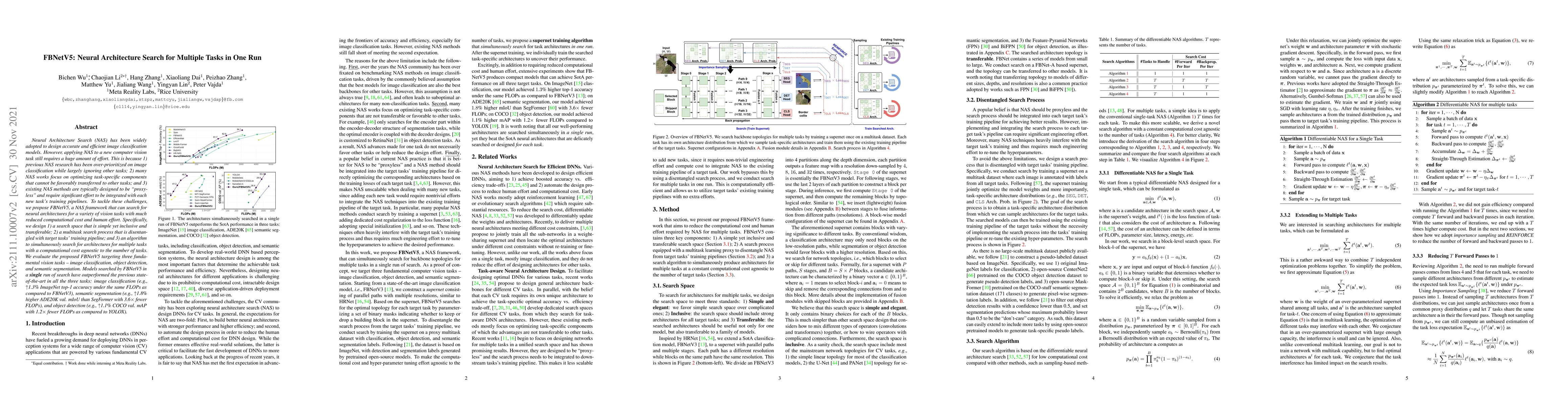 Researchers propose FBNetV5, a neural architecture search framework that can optimize models for multiple computer vision tasks in one run, reducing computational cost and human effort. The framework achieves state-of-the-art performance on three fundamental vision tasks: image classification, object detection, and semantic segmentation.