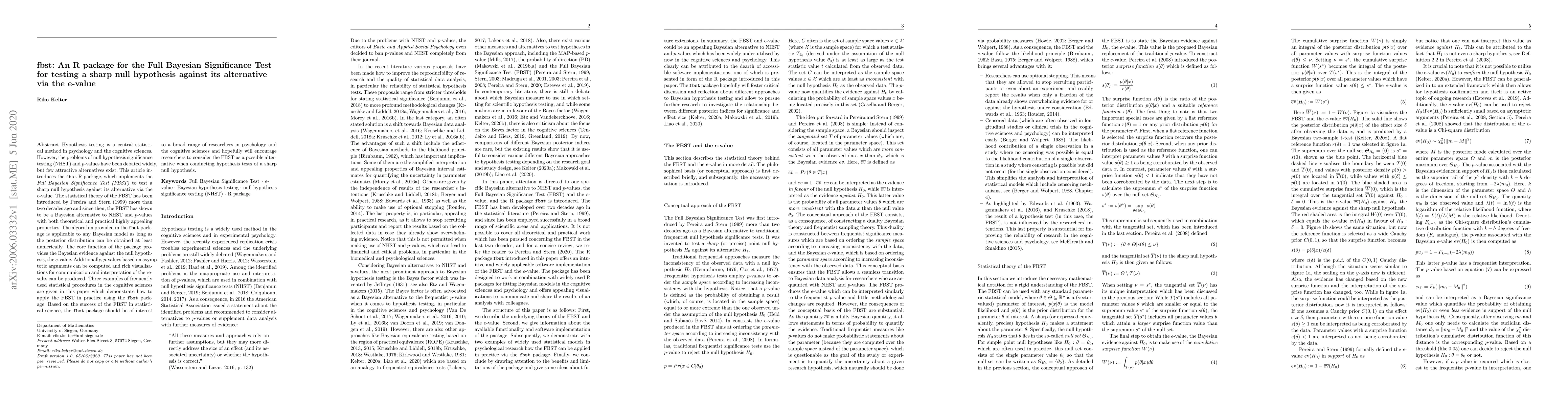 The fbst R package implements the Full Bayesian Significance Test (FBST) to provide a Bayesian alternative to traditional null hypothesis significance testing, offering the e-value to test sharp null hypotheses. The package is applicable to any Bayesian model and includes visualization tools for result interpretation.