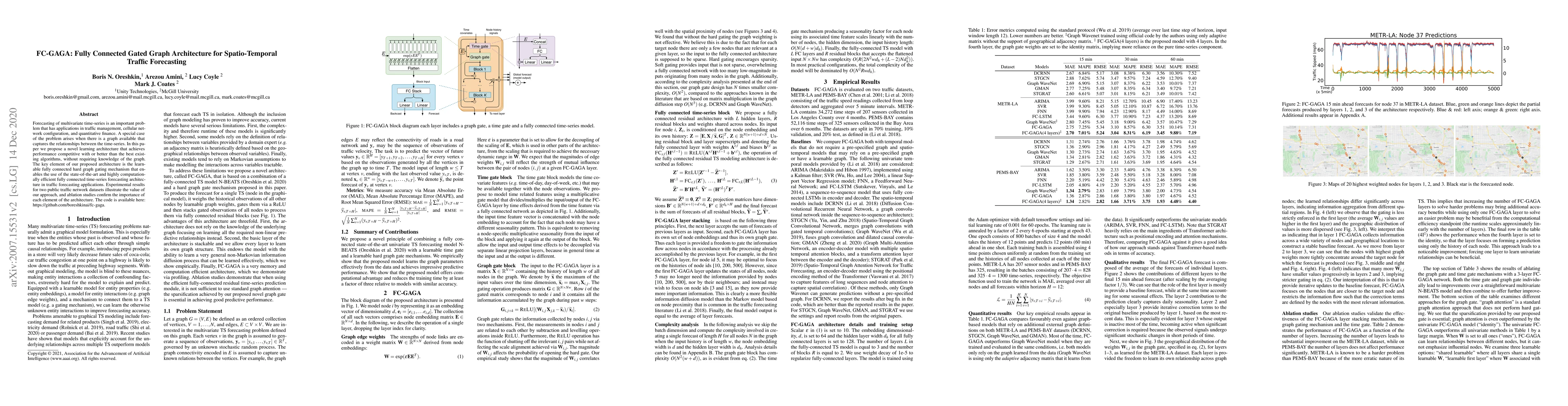 Forecasting of multivariate time-series is an important problem that has applications in traffic management, cellular network configuration, and quantitative finance. A special case of the problem arises when there is a graph available that captures the relationships between the time-series. In this paper we propose a novel learning architecture that achieves performance competitive with or better than the best existing algorithms, without requiring knowledge of the graph. The key element of our proposed architecture is the learnable fully connected hard graph gating mechanism that enables the use of the state-of-the-art and highly computationally efficient fully connected time-series forecasting architecture in traffic forecasting applications. Experimental results for two public traffic network datasets illustrate the value of our approach, and ablation studies confirm the importance of each element of the architecture. The code is available here: https://github.com/boreshkinai/fc-gaga.
